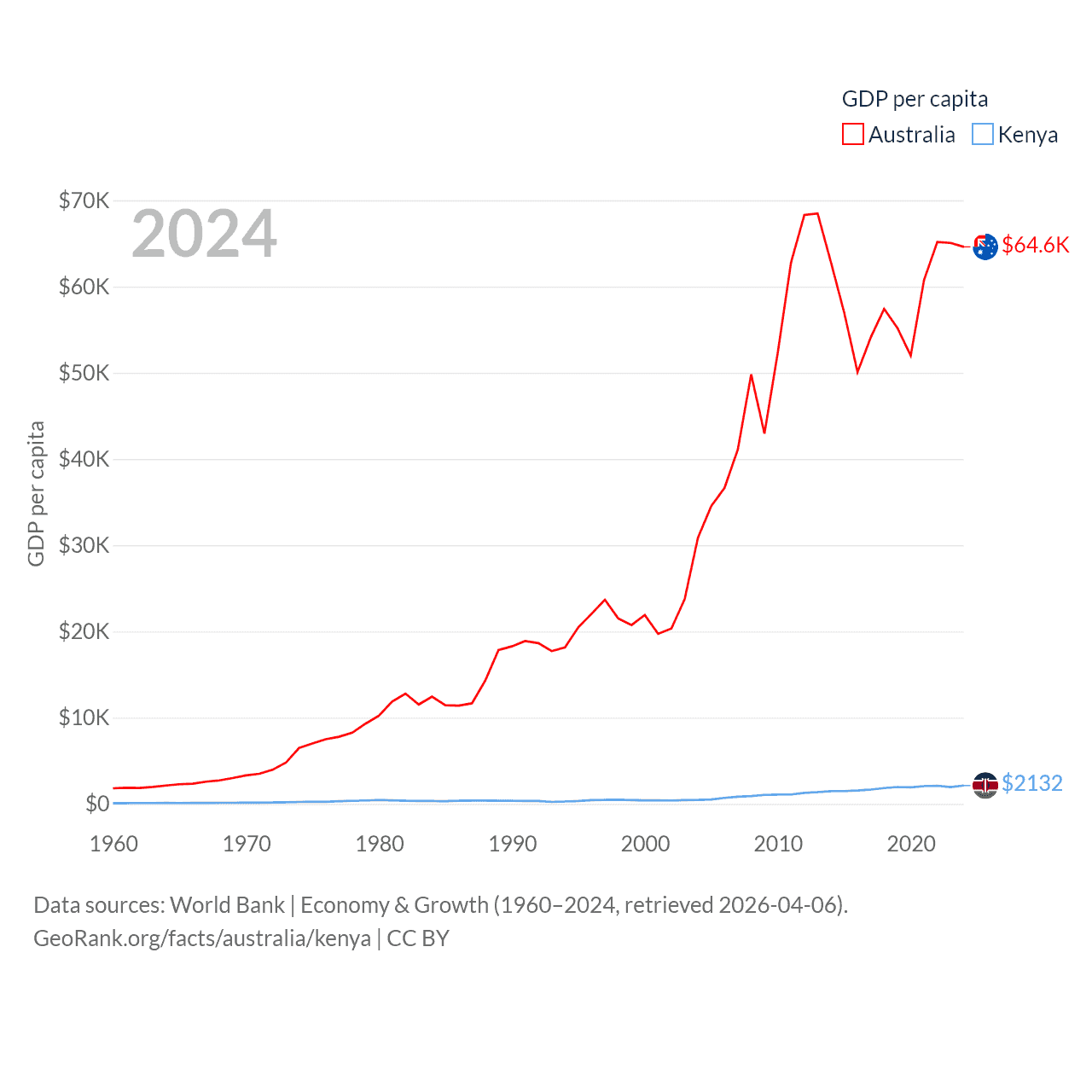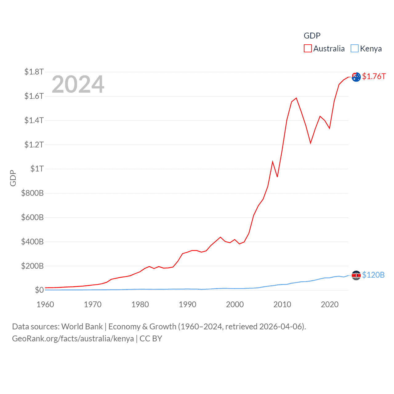 By GDP, Australia ranks 14/197 ($1.76T) and Kenya ranks 64/197 ($120B). By GDP per capita, Australia ranks 14/197 ($64,604), while Kenya ranks 154/197 ($2,132).