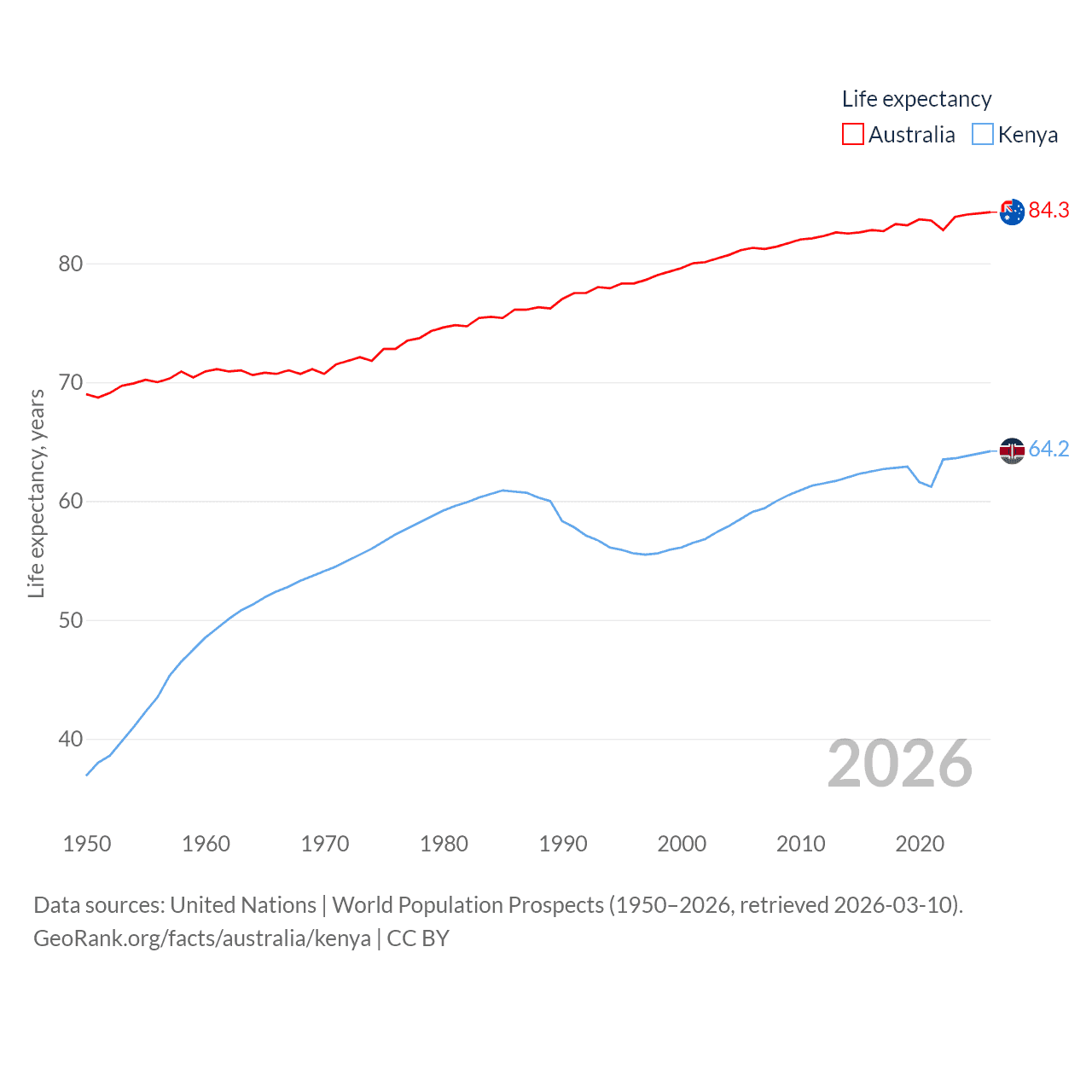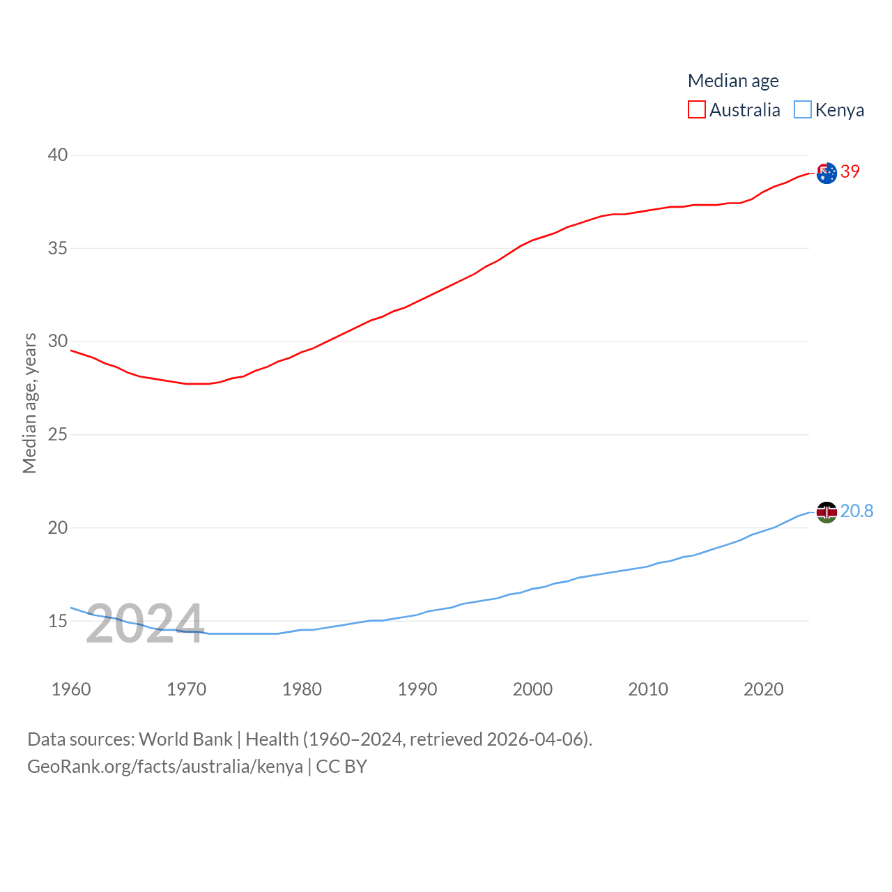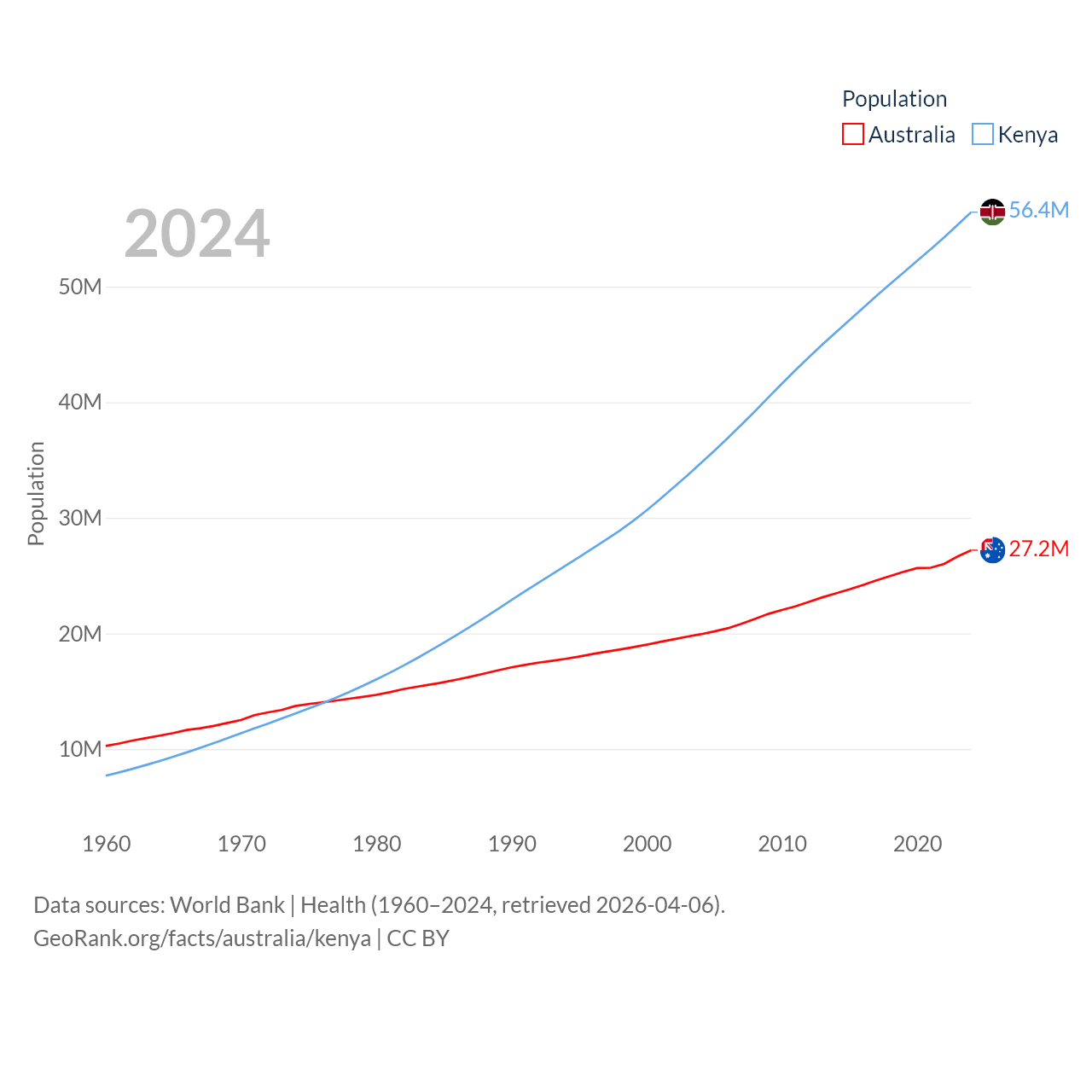 Australia has a population of 27.2M (ranked 54/197), compared with 56.4M in Kenya (ranked 26/197). Australia's land area is 2,969,906 sq mi versus 224,278 sq mi for Kenya (ranked 6th vs. 45th).