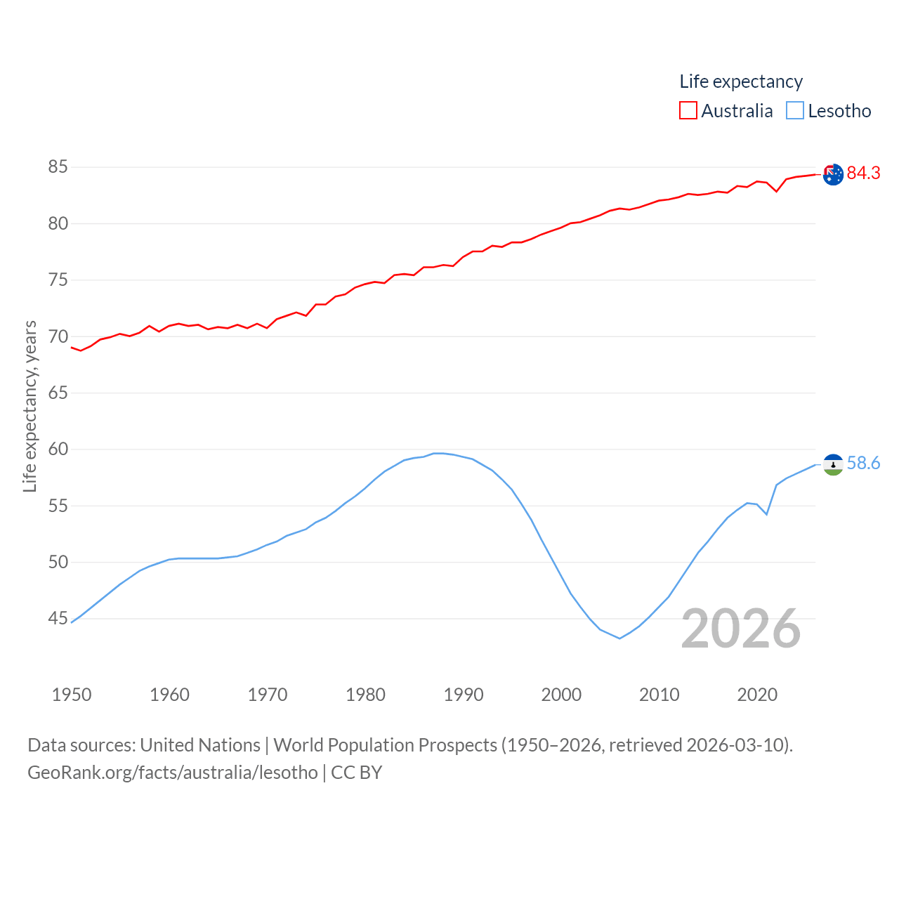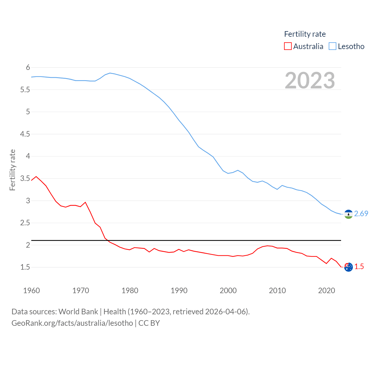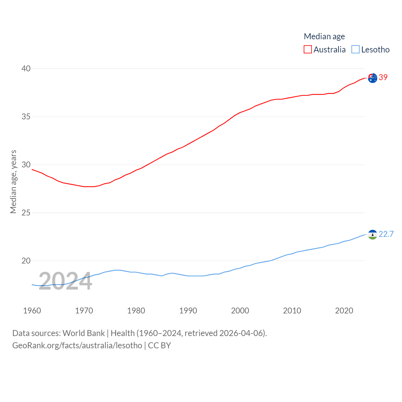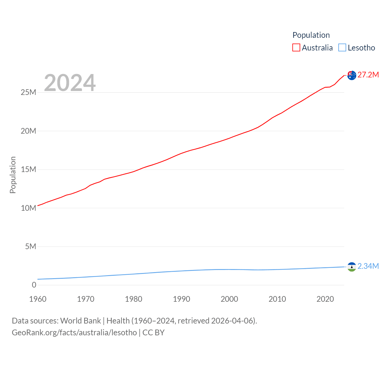 Australia has a population of 27.2M (ranked 54/197), compared with 2.34M in Lesotho (ranked 145/197). Australia's land area is 2,969,906 sq mi versus 11,722 sq mi for Lesotho (ranked 6th vs. 137th).