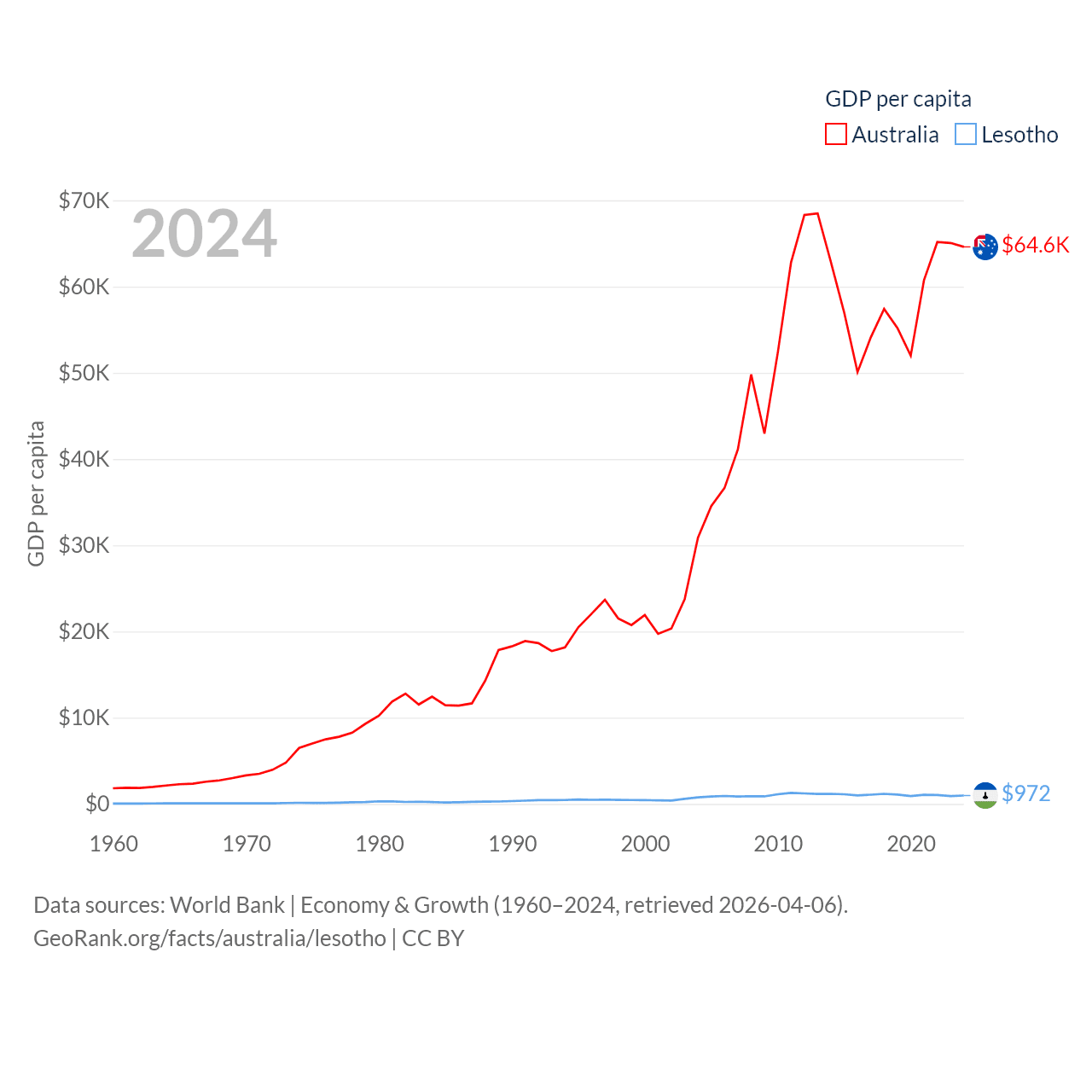 By GDP, Australia ranks 14/197 ($1.76T) and Lesotho ranks 175/197 ($2.27B). By GDP per capita, Australia ranks 14/197 ($64,604), while Lesotho ranks 181/197 ($972).