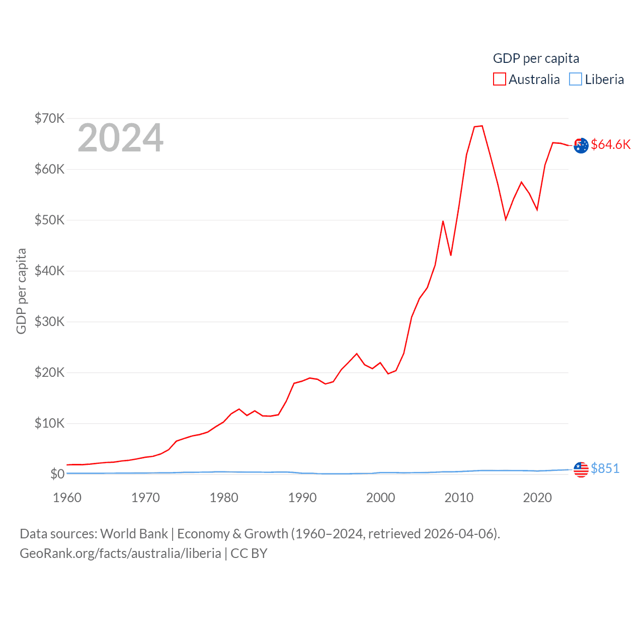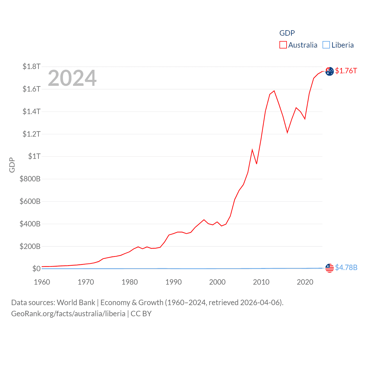 By GDP, Australia ranks 14/197 ($1.76T) and Liberia ranks 163/197 ($4.78B). By GDP per capita, Australia ranks 14/197 ($64,604), while Liberia ranks 184/197 ($851).