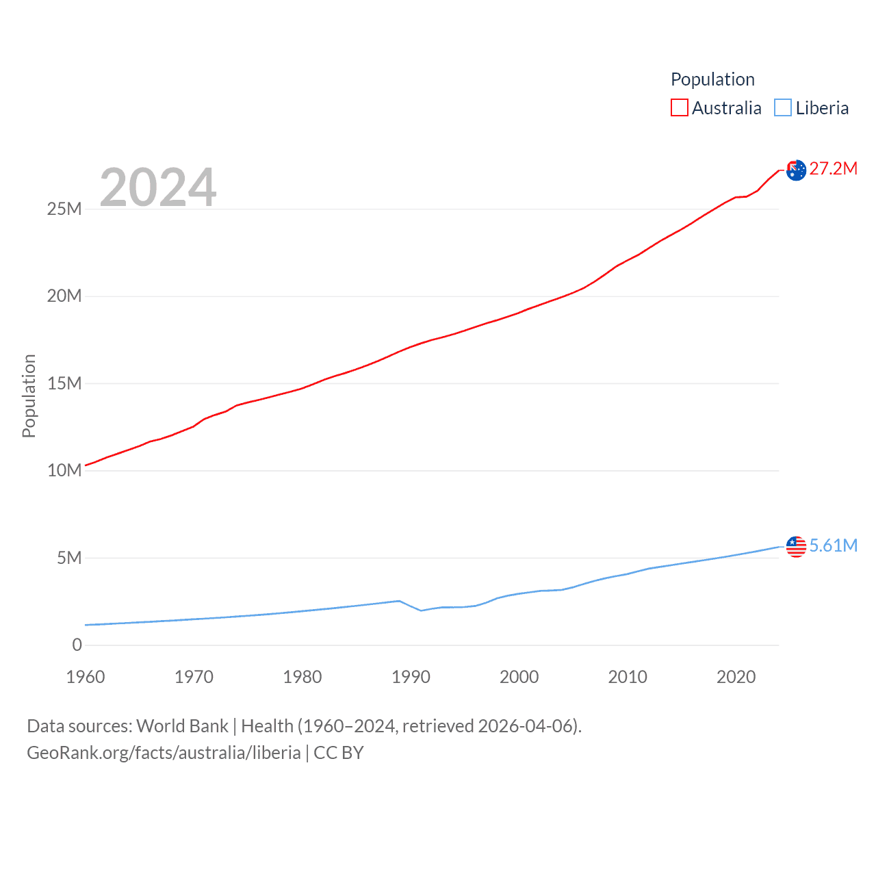 Australia has a population of 27.2M (ranked 54/197), compared with 5.61M in Liberia (ranked 117/197). Australia's land area is 2,969,906 sq mi versus 37,189 sq mi for Liberia (ranked 6th vs. 106th).