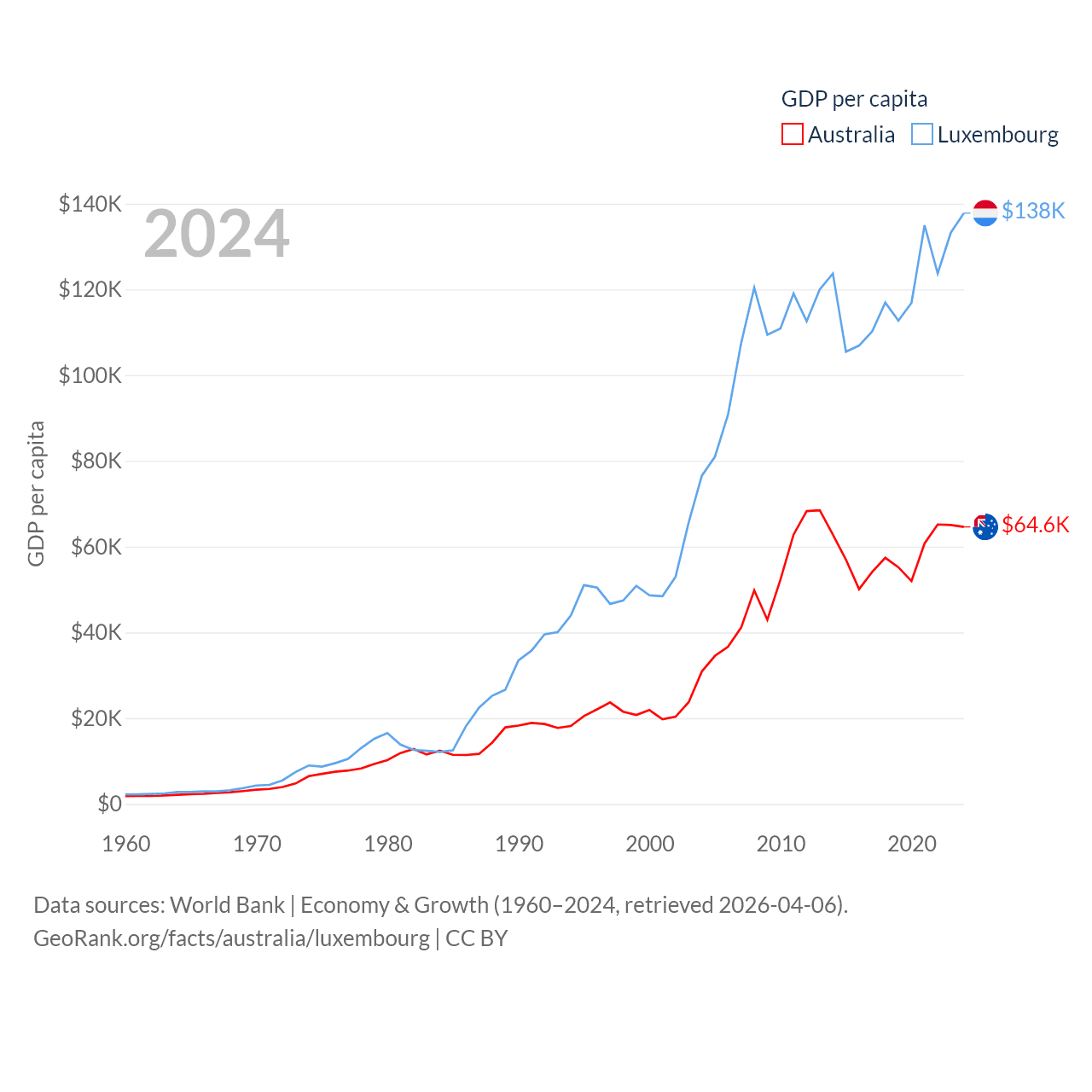 By GDP, Australia ranks 14/197 ($1.76T) and Luxembourg ranks 74/197 ($93.3B). By GDP per capita, Australia ranks 14/197 ($64,604), while Luxembourg ranks 3/197 ($137,782).