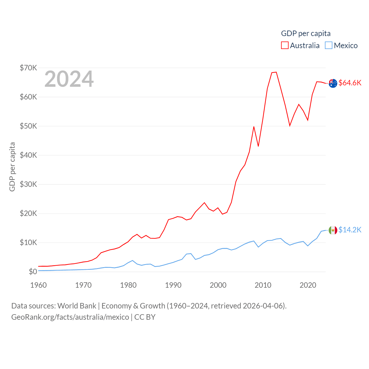 By GDP, Australia ranks 14/197 ($1.76T) and Mexico ranks 13/197 ($1.86T). By GDP per capita, Australia ranks 14/197 ($64,604), while Mexico ranks 69/197 ($14,186).