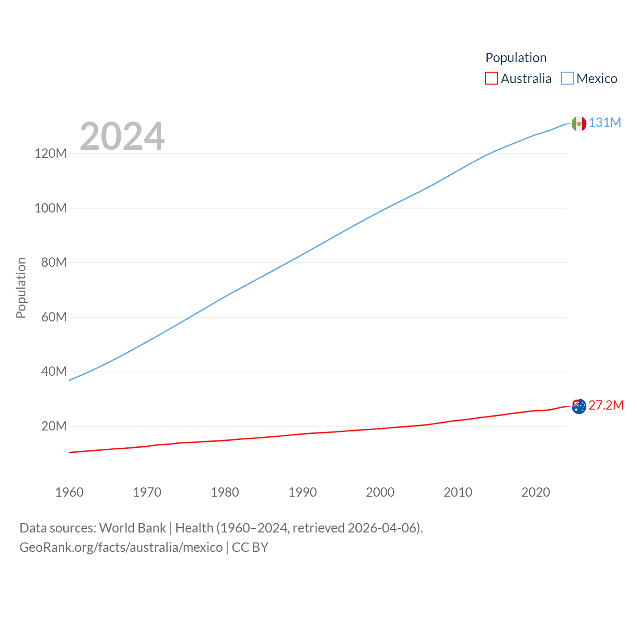 Australia has a population of 27.2M (ranked 54/197), compared with 131M in Mexico (ranked 11/197). Australia's land area is 2,969,906 sq mi versus 750,563 sq mi for Mexico (ranked 6th vs. 13th).