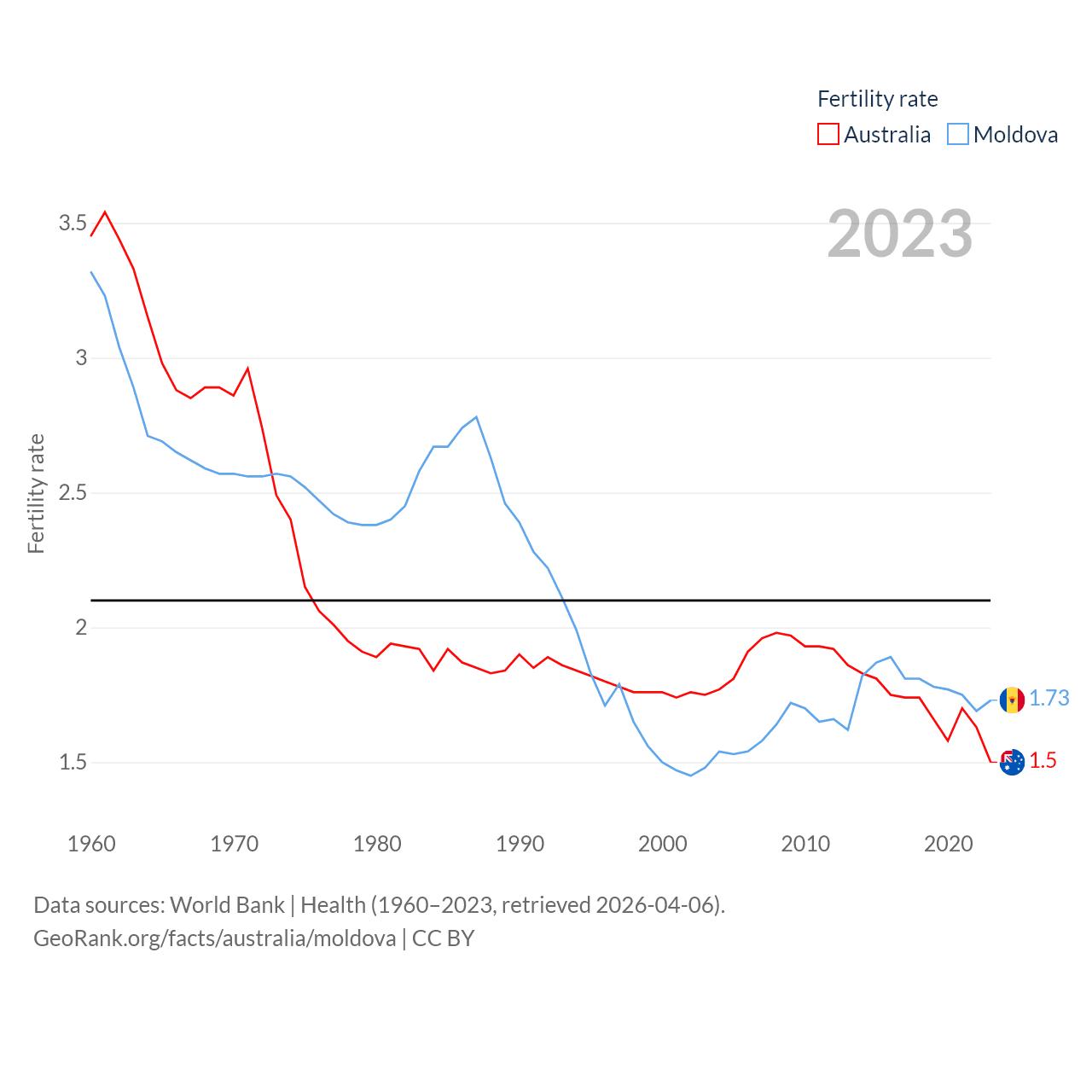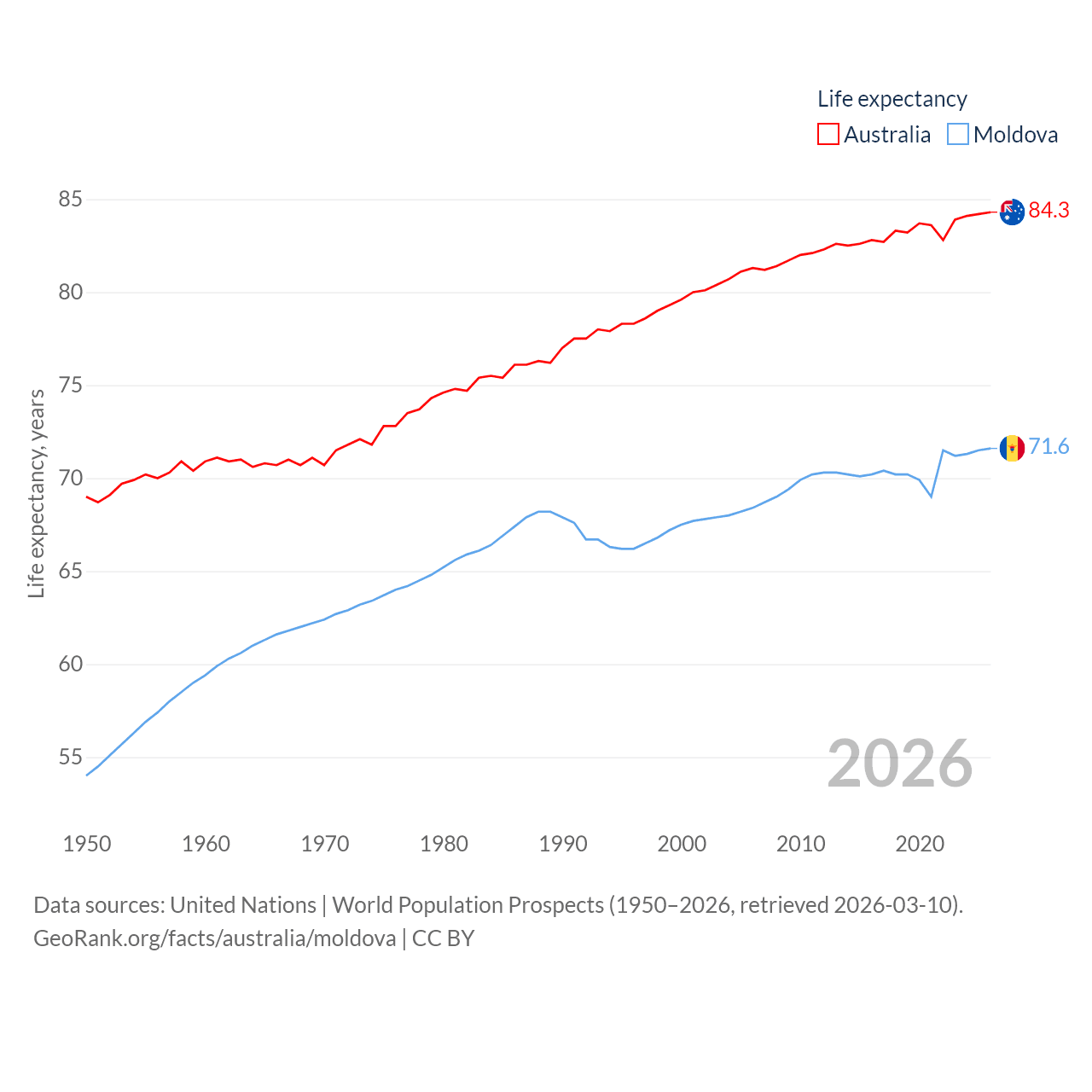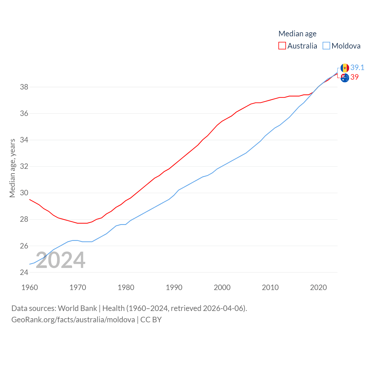 Australia has a population of 27.2M (ranked 54/197), compared with 2.4M in Moldova (ranked 143/197). Australia's land area is 2,969,906 sq mi versus 12,714 sq mi for Moldova (ranked 6th vs. 135th).