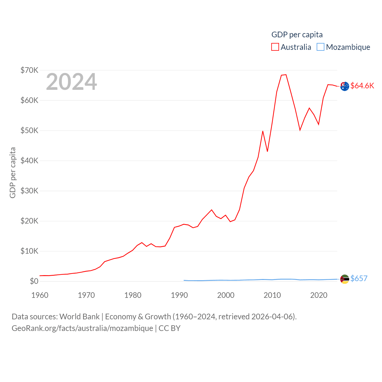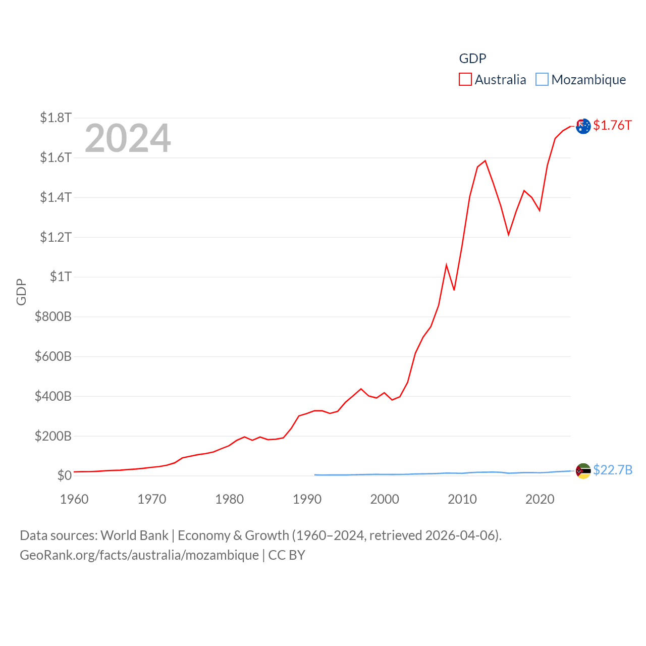 By GDP, Australia ranks 14/197 ($1.76T) and Mozambique ranks 123/197 ($22.7B). By GDP per capita, Australia ranks 14/197 ($64,604), while Mozambique ranks 189/197 ($657).