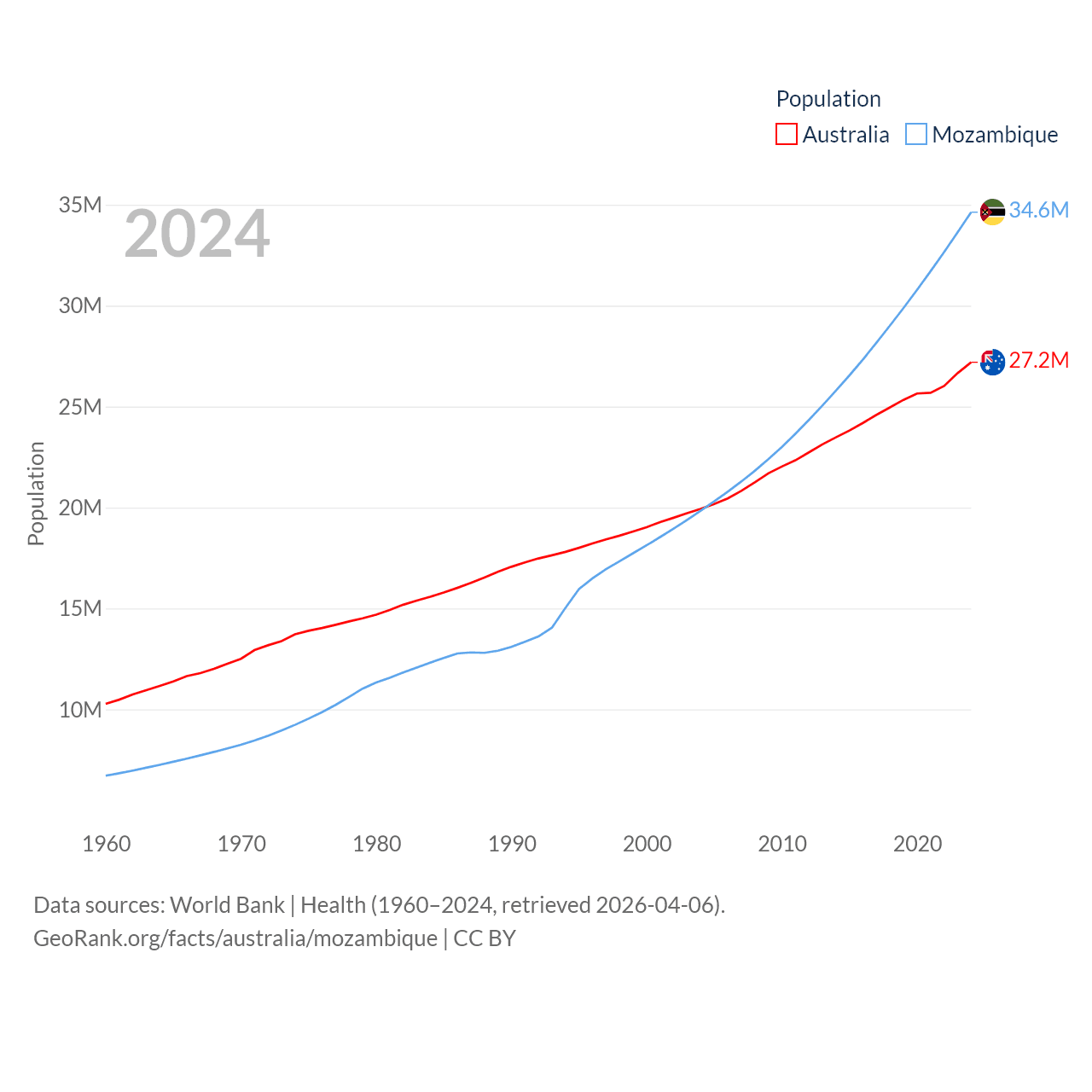 Australia has a population of 27.2M (ranked 54/197), compared with 34.6M in Mozambique (ranked 46/197). Australia's land area is 2,969,906 sq mi versus 303,623 sq mi for Mozambique (ranked 6th vs. 34th).