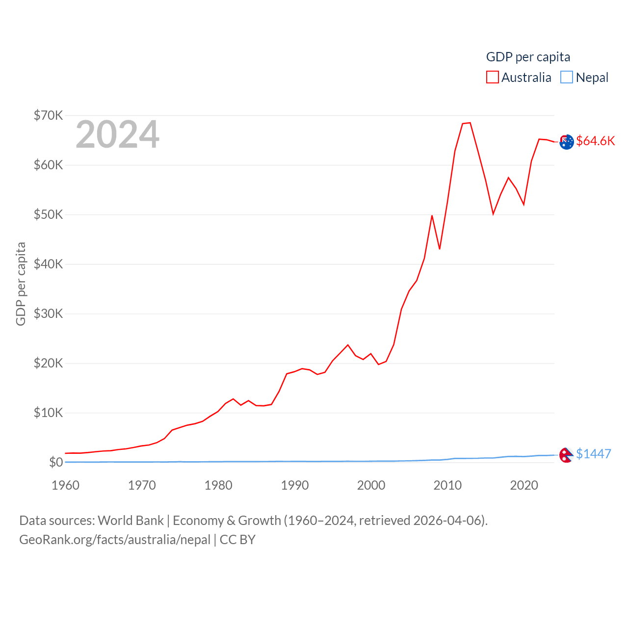 By GDP, Australia ranks 14/197 ($1.76T) and Nepal ranks 101/197 ($42.9B). By GDP per capita, Australia ranks 14/197 ($64,604), while Nepal ranks 164/197 ($1,447).