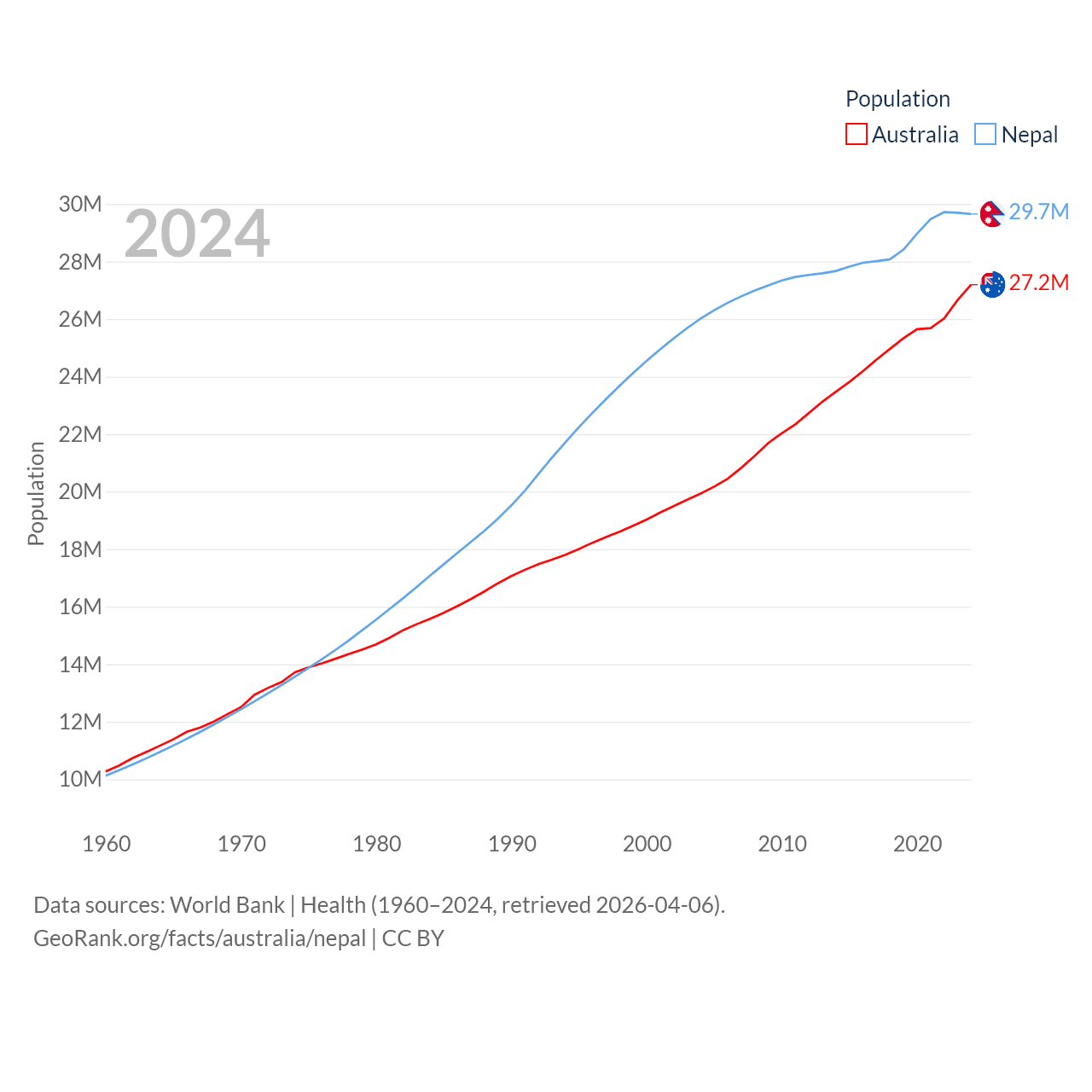 Australia has a population of 27.2M (ranked 54/197), compared with 29.7M in Nepal (ranked 51/197). Australia's land area is 2,969,906 sq mi versus 55,348 sq mi for Nepal (ranked 6th vs. 92nd).