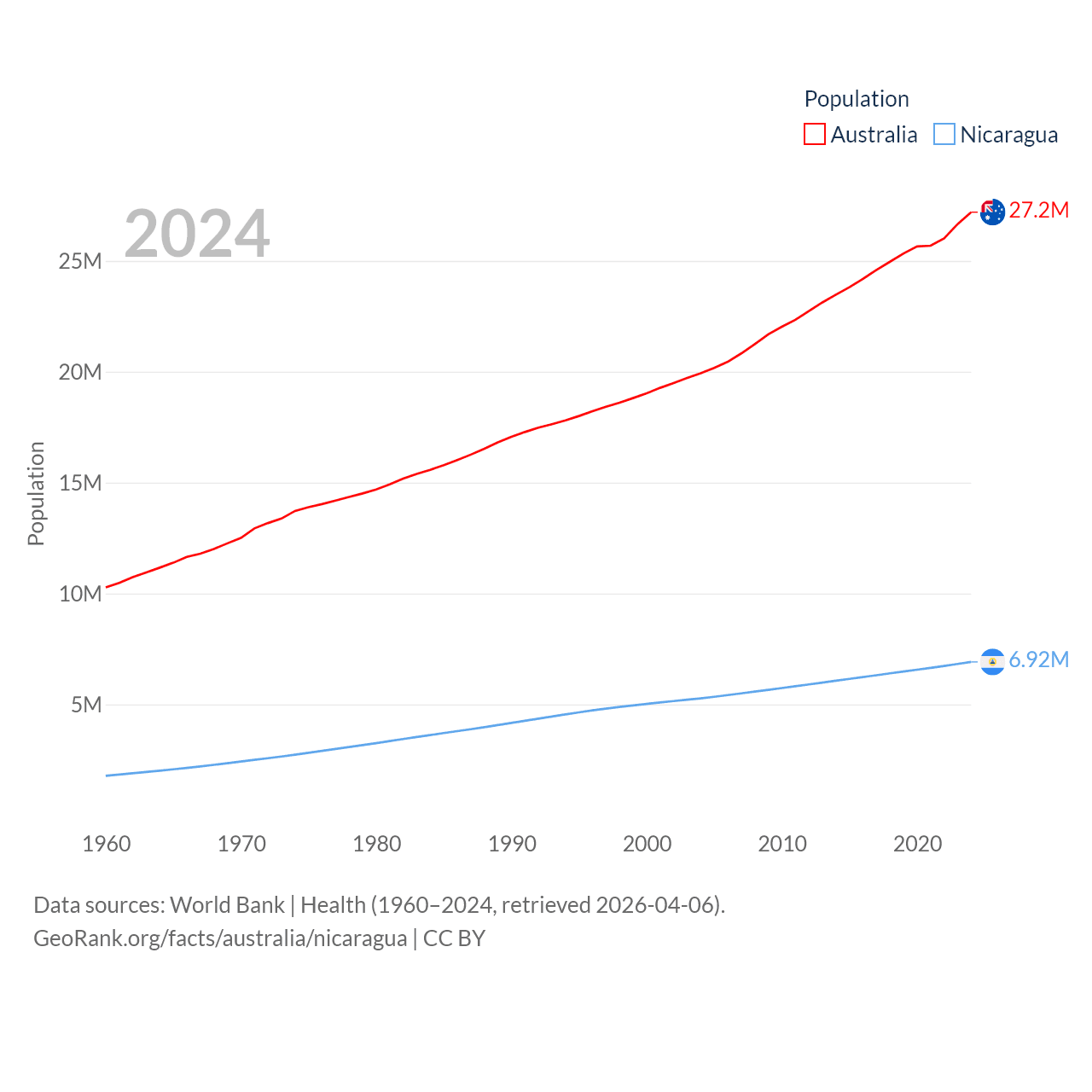 Australia has a population of 27.2M (ranked 54/197), compared with 6.92M in Nicaragua (ranked 108/197). Australia's land area is 2,969,906 sq mi versus 46,464 sq mi for Nicaragua (ranked 6th vs. 98th).