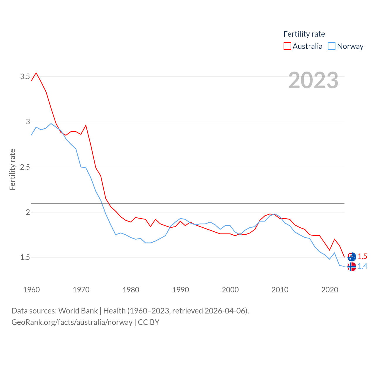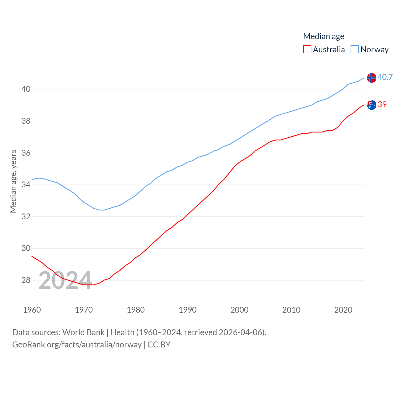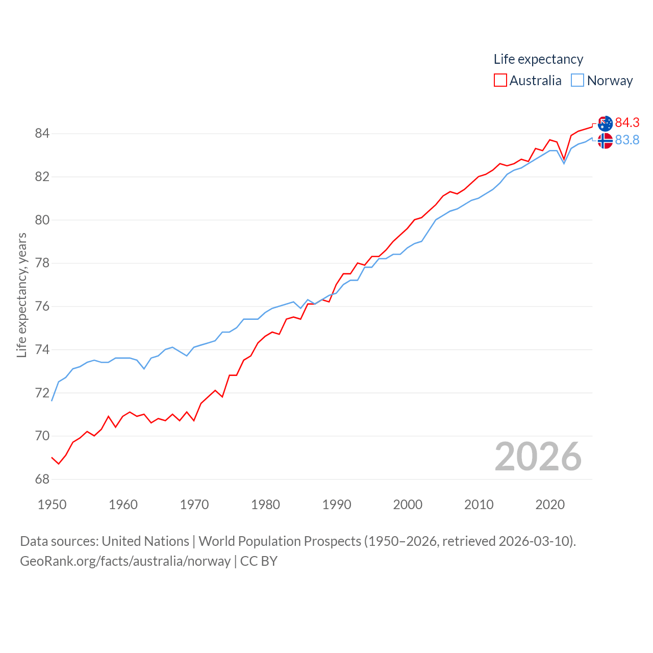 Australia has a population of 27.2M (ranked 54/197), compared with 5.57M in Norway (ranked 118/197). Australia's land area is 2,969,906 sq mi versus 140,645 sq mi for Norway (ranked 6th vs. 62nd).