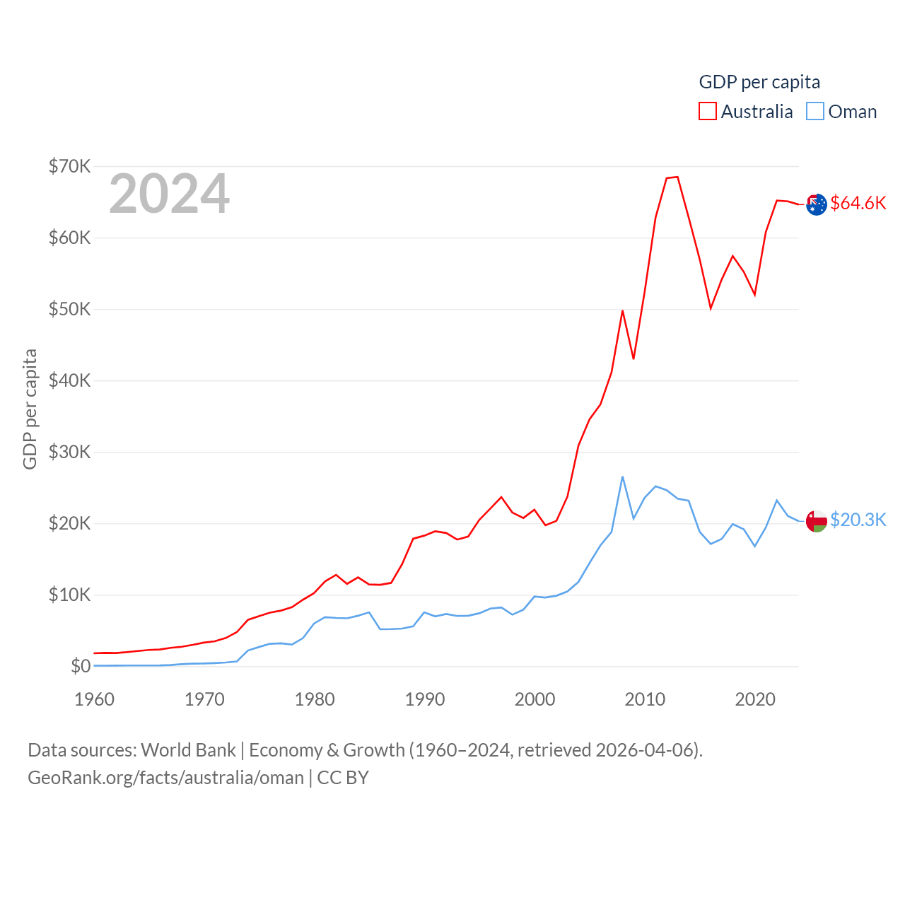 By GDP, Australia ranks 14/197 ($1.76T) and Oman ranks 70/197 ($107B). By GDP per capita, Australia ranks 14/197 ($64,604), while Oman ranks 57/197 ($20,285).