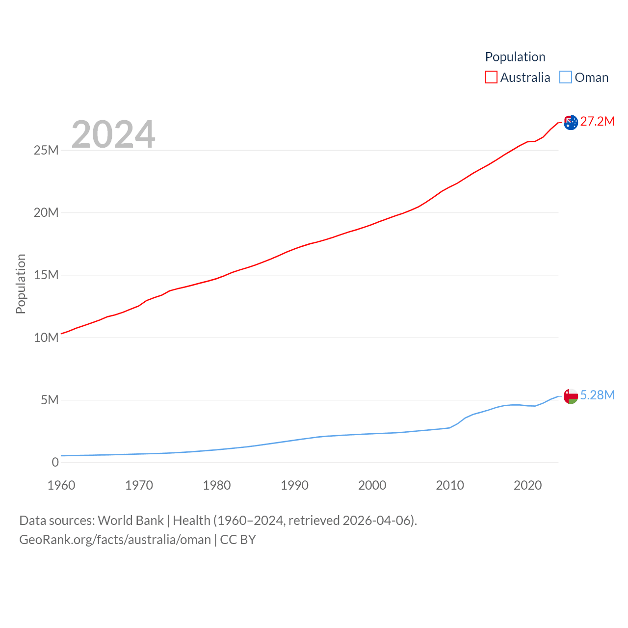 Australia has a population of 27.2M (ranked 54/197), compared with 5.28M in Oman (ranked 124/197). Australia's land area is 2,969,906 sq mi versus 119,499 sq mi for Oman (ranked 6th vs. 68th).