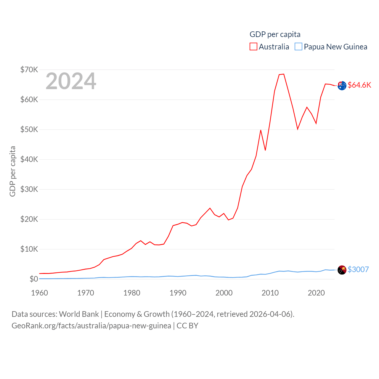 By GDP, Australia ranks 14/197 ($1.76T) and Papua New Guinea ranks 110/197 ($31.8B). By GDP per capita, Australia ranks 14/197 ($64,604), while Papua New Guinea ranks 140/197 ($3,007).
