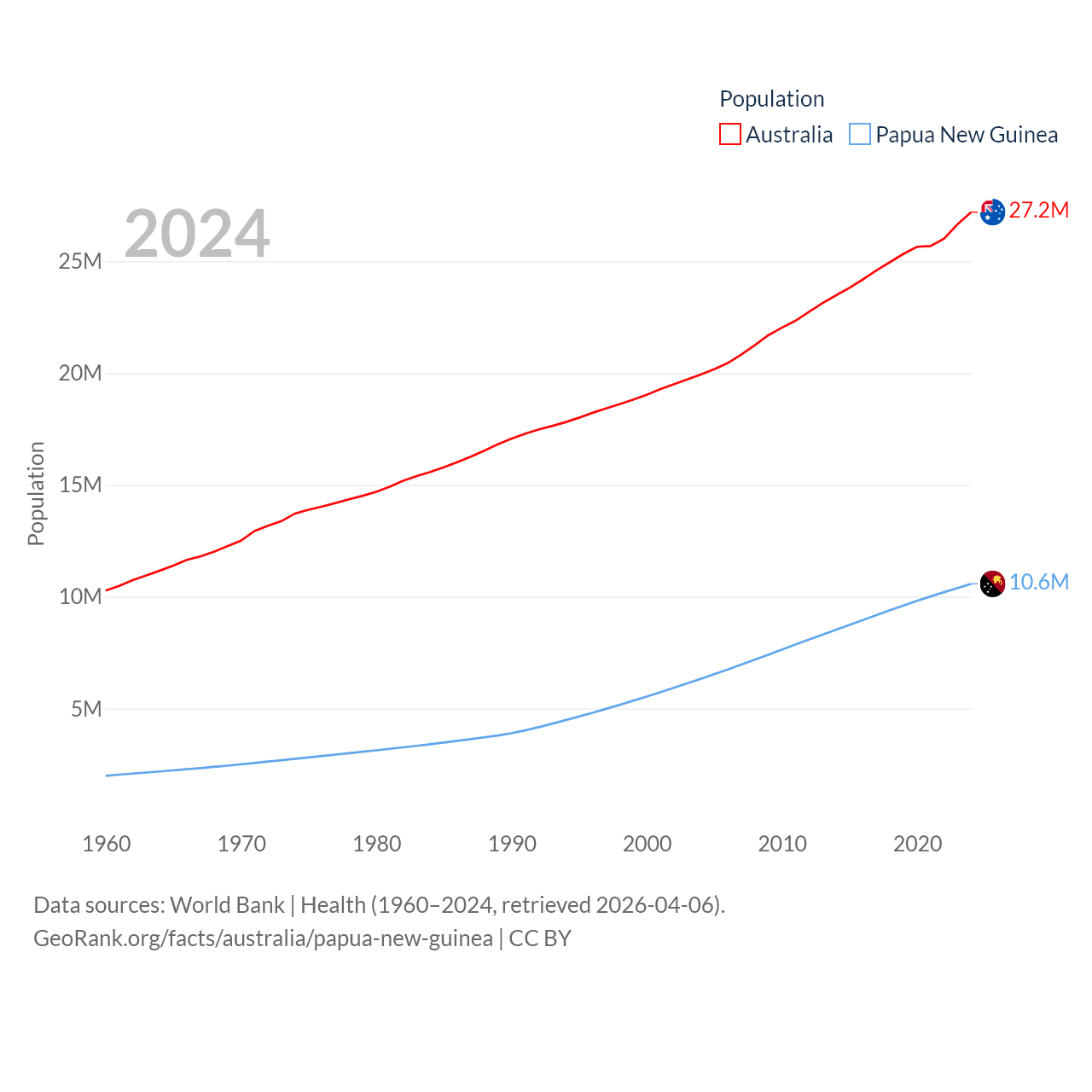 Australia has a population of 27.2M (ranked 54/197), compared with 10.6M in Papua New Guinea (ranked 92/197). Australia's land area is 2,969,906 sq mi versus 174,850 sq mi for Papua New Guinea (ranked 6th vs. 54th).