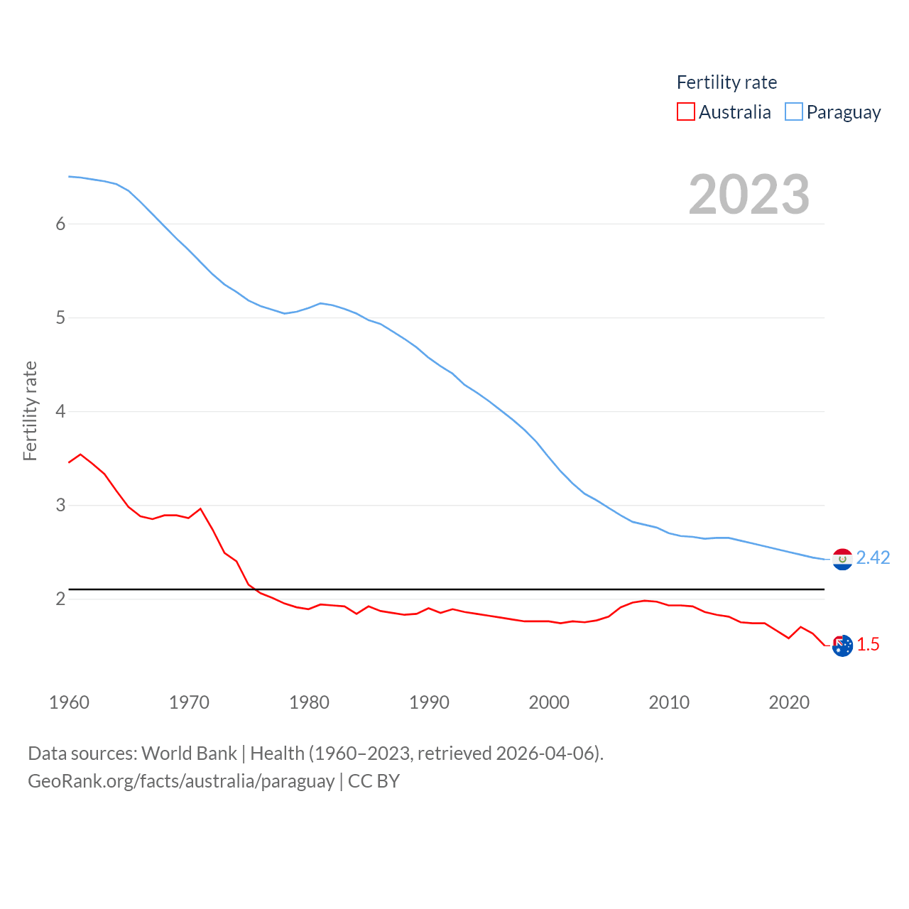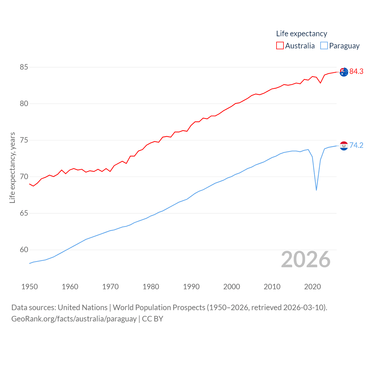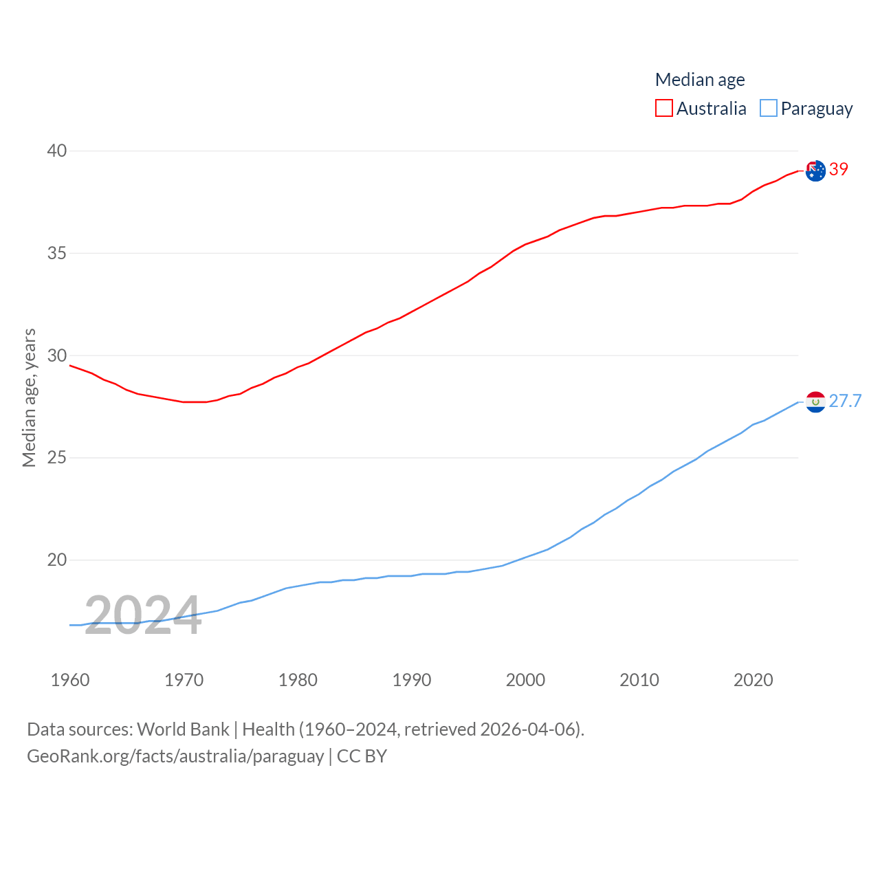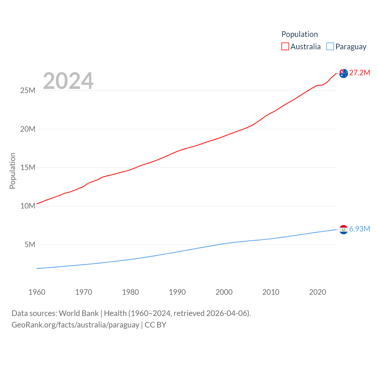 Australia has a population of 27.2M (ranked 54/197), compared with 6.93M in Paraguay (ranked 107/197). Australia's land area is 2,969,906 sq mi versus 152,901 sq mi for Paraguay (ranked 6th vs. 59th).
