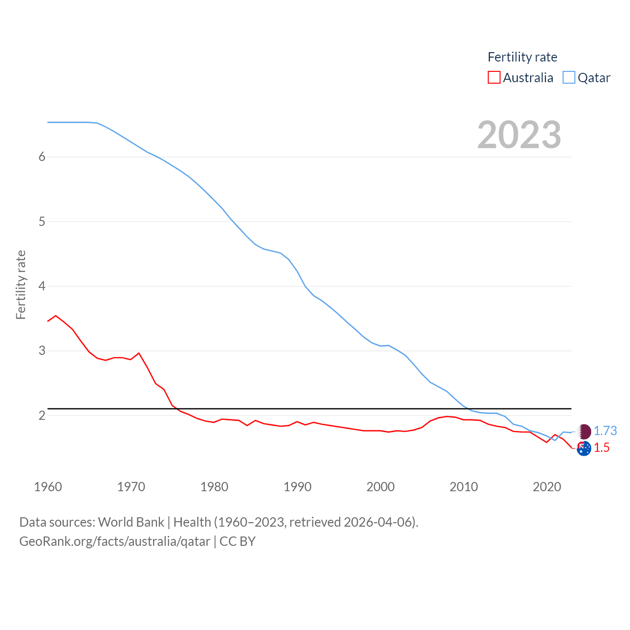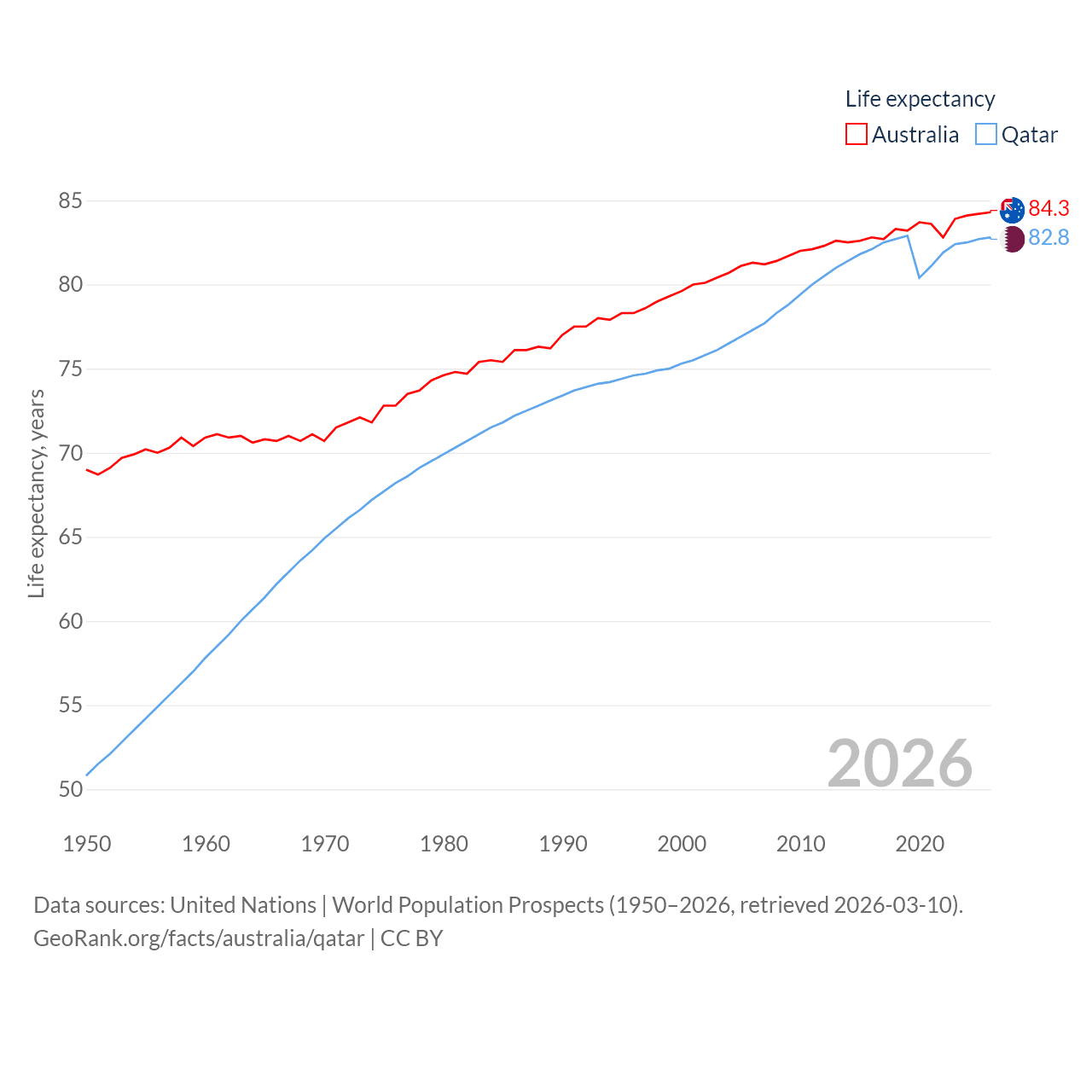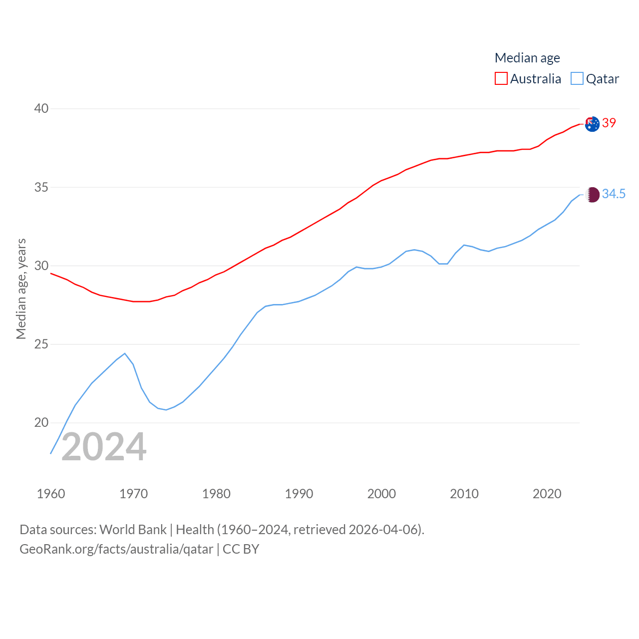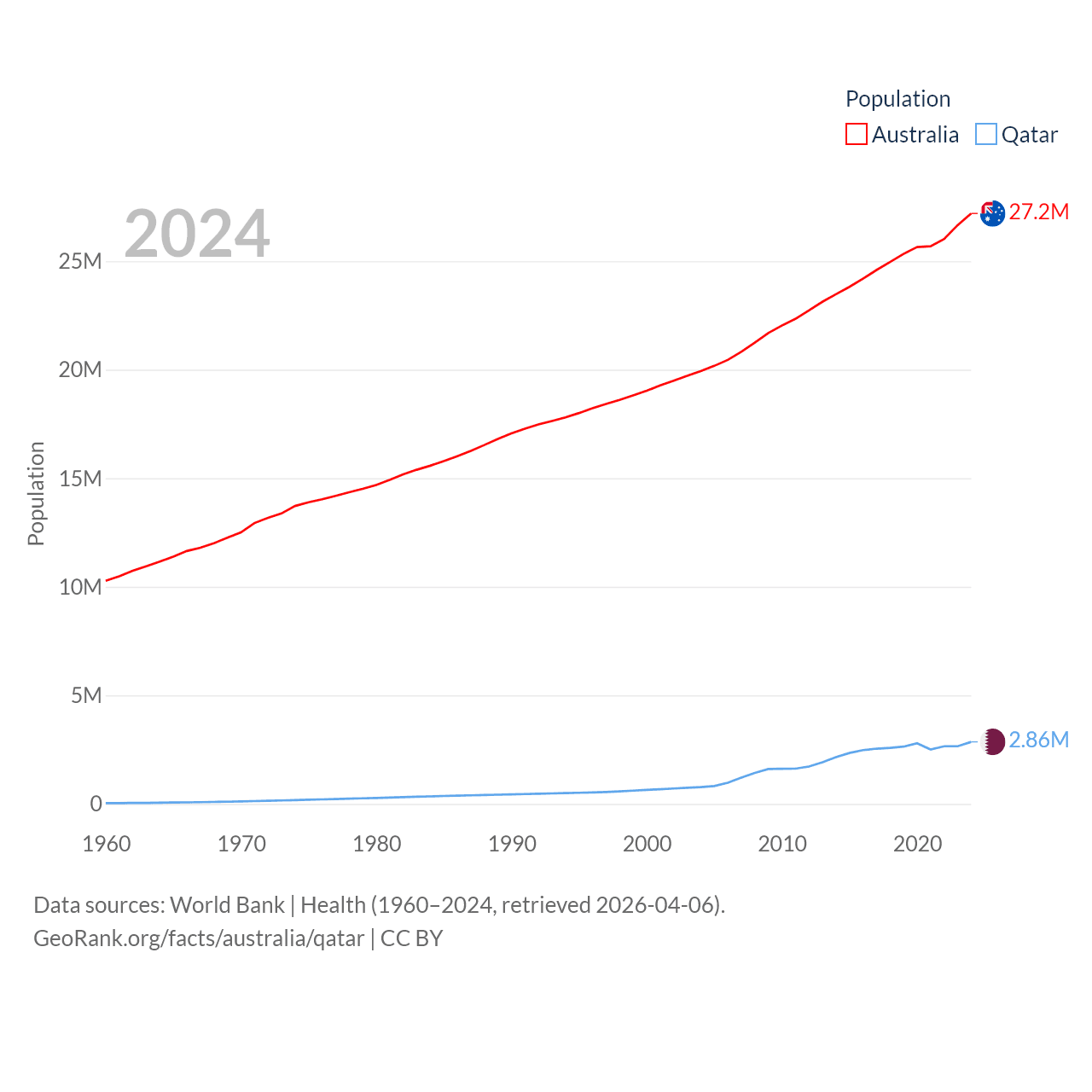 Australia has a population of 27.2M (ranked 54/197), compared with 2.86M in Qatar (ranked 138/197). Australia's land area is 2,969,906 sq mi versus 4,436 sq mi for Qatar (ranked 6th vs. 158th).