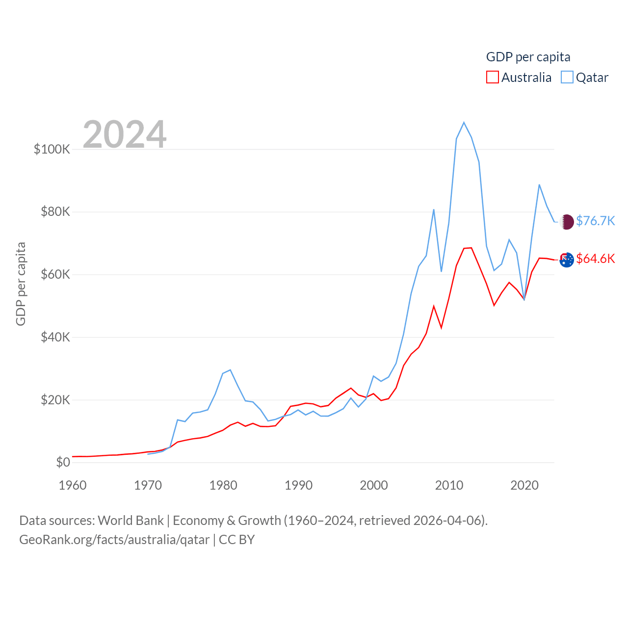 By GDP, Australia ranks 14/197 ($1.76T) and Qatar ranks 56/197 ($219B). By GDP per capita, Australia ranks 14/197 ($64,604), while Qatar ranks 11/197 ($76,689).