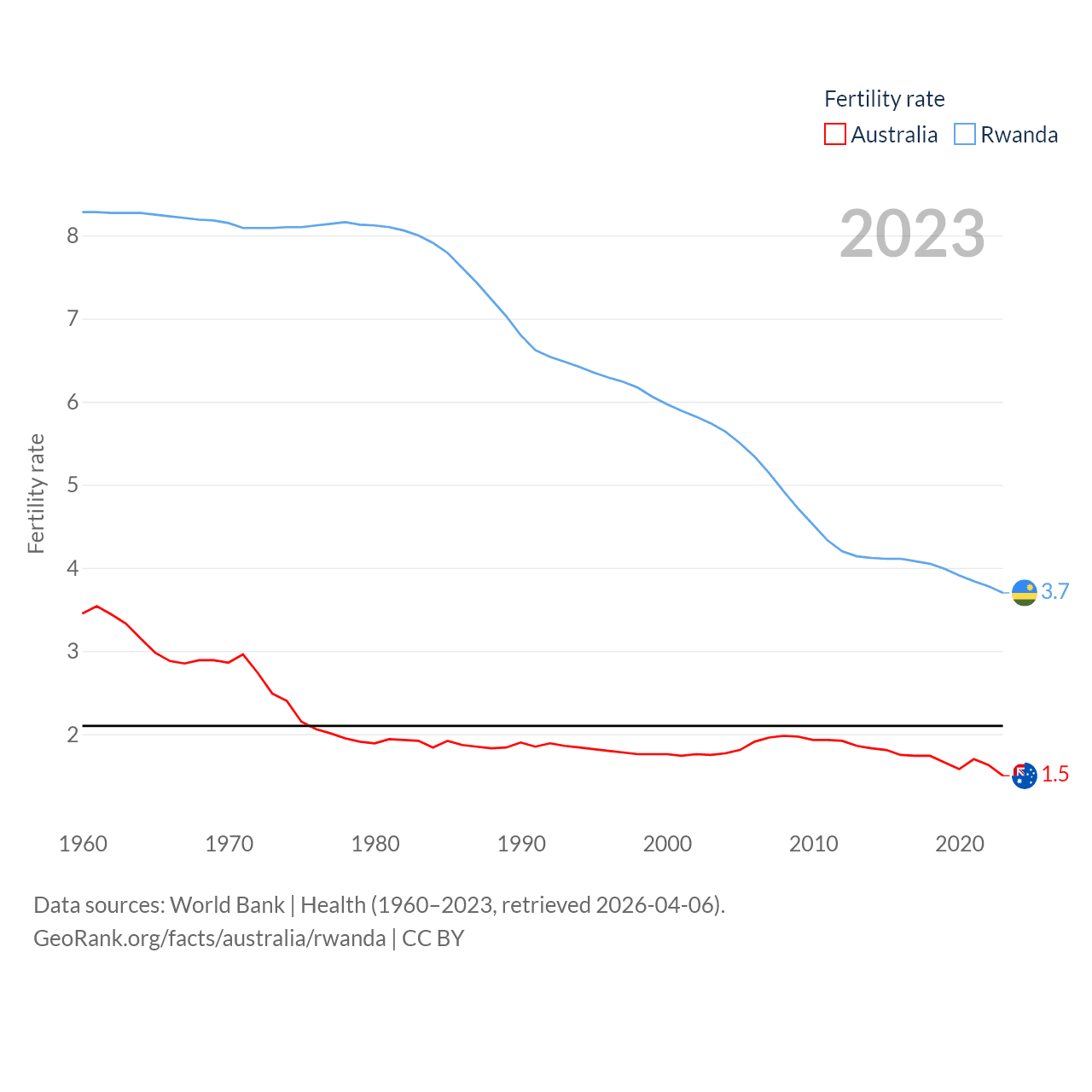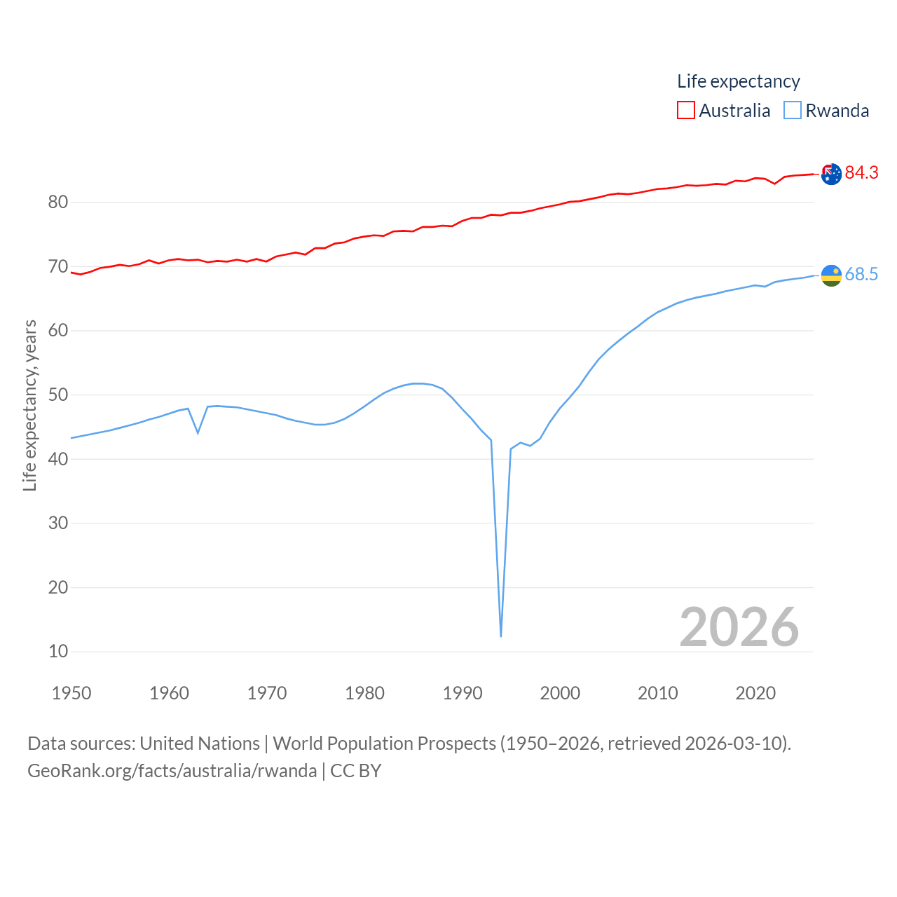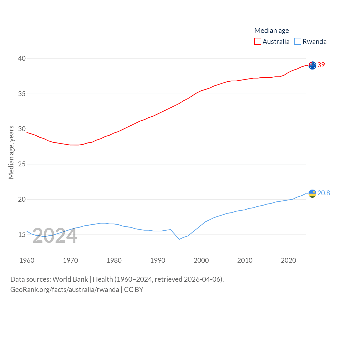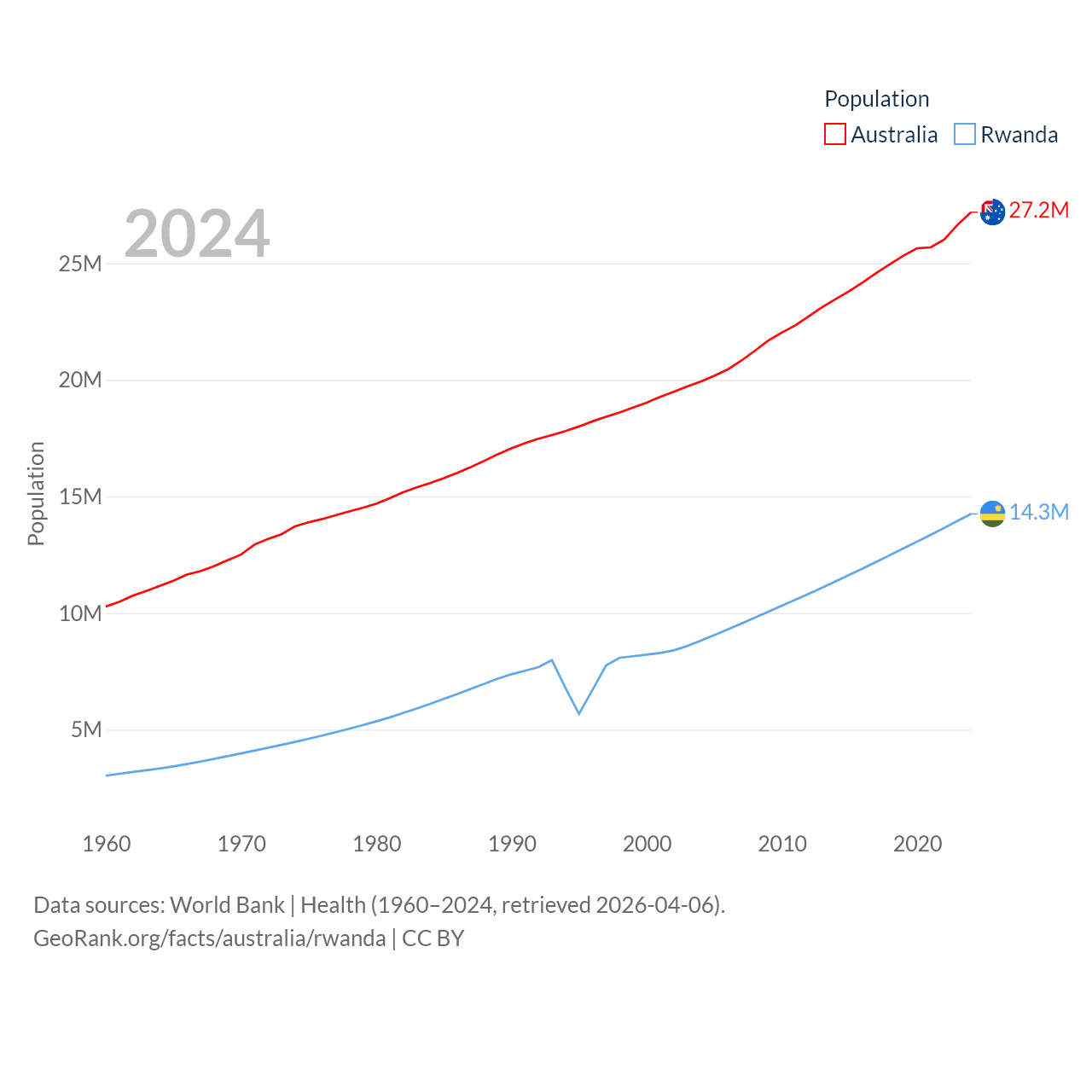 Australia has a population of 27.2M (ranked 54/197), compared with 14.3M in Rwanda (ranked 77/197). Australia's land area is 2,969,906 sq mi versus 9,525 sq mi for Rwanda (ranked 6th vs. 146th).