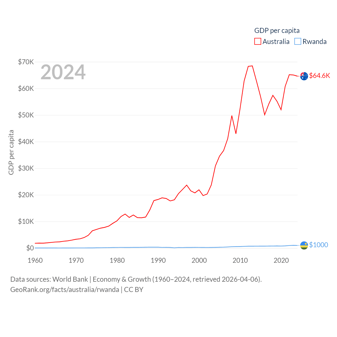 By GDP, Australia ranks 14/197 ($1.76T) and Rwanda ranks 144/197 ($14.3B). By GDP per capita, Australia ranks 14/197 ($64,604), while Rwanda ranks 178/197 ($1,000).