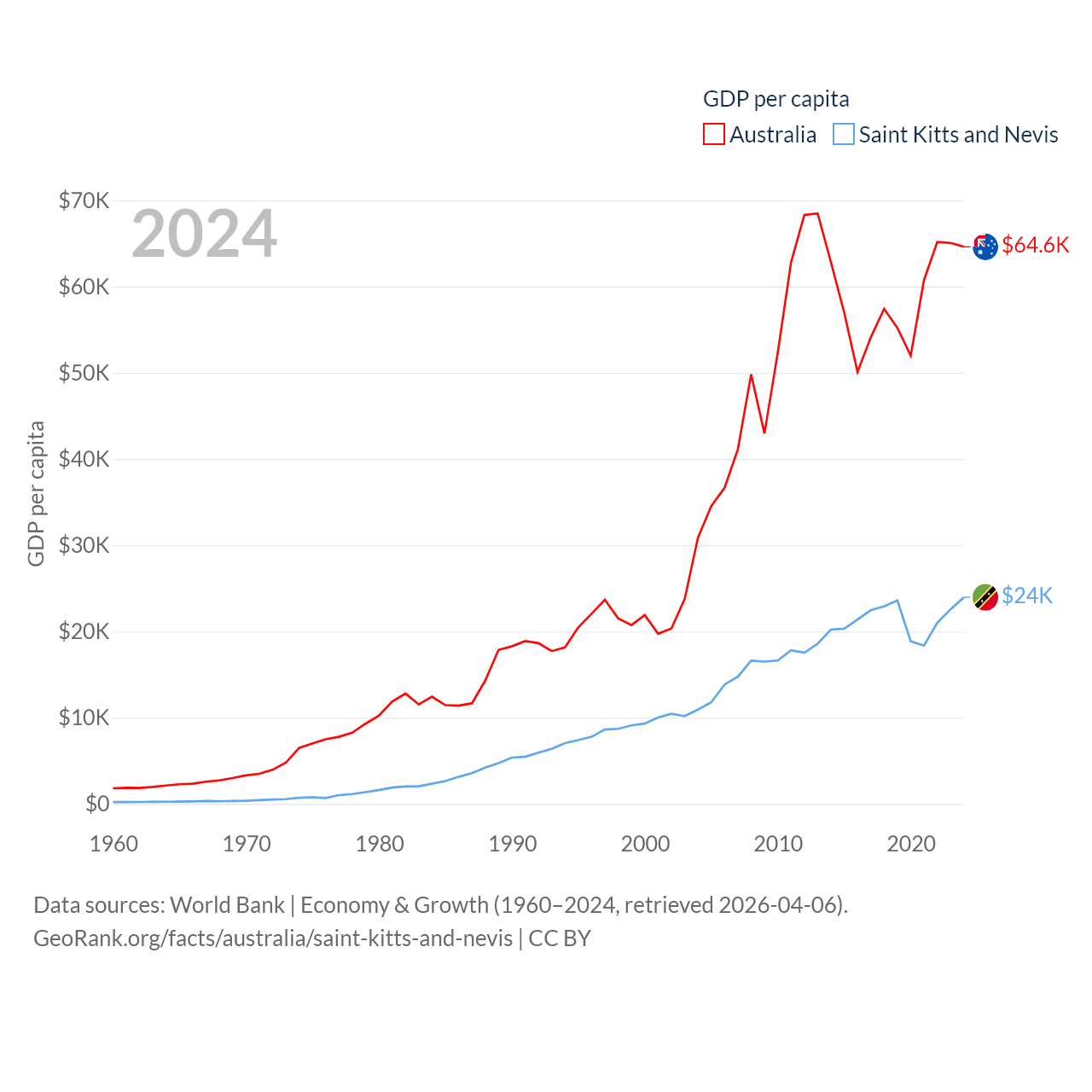 By GDP, Australia ranks 14/197 ($1.76T) and Saint Kitts and Nevis ranks 187/197 ($1.12B). By GDP per capita, Australia ranks 14/197 ($64,604), while Saint Kitts and Nevis ranks 51/197 ($23,961).