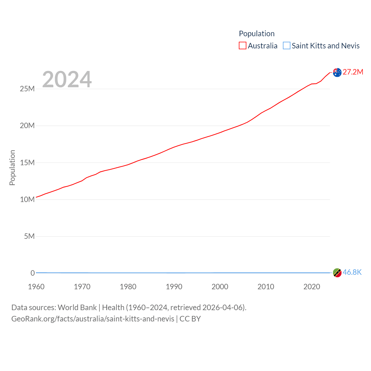 Australia has a population of 27.2M (ranked 54/197), compared with 46.8K in Saint Kitts and Nevis (ranked 189/197). Australia's land area is 2,969,906 sq mi versus 100.4 sq mi for Saint Kitts and Nevis (ranked 6th vs. 189th).
