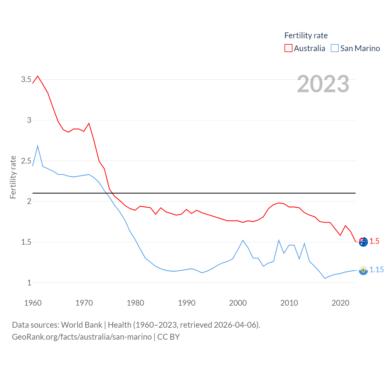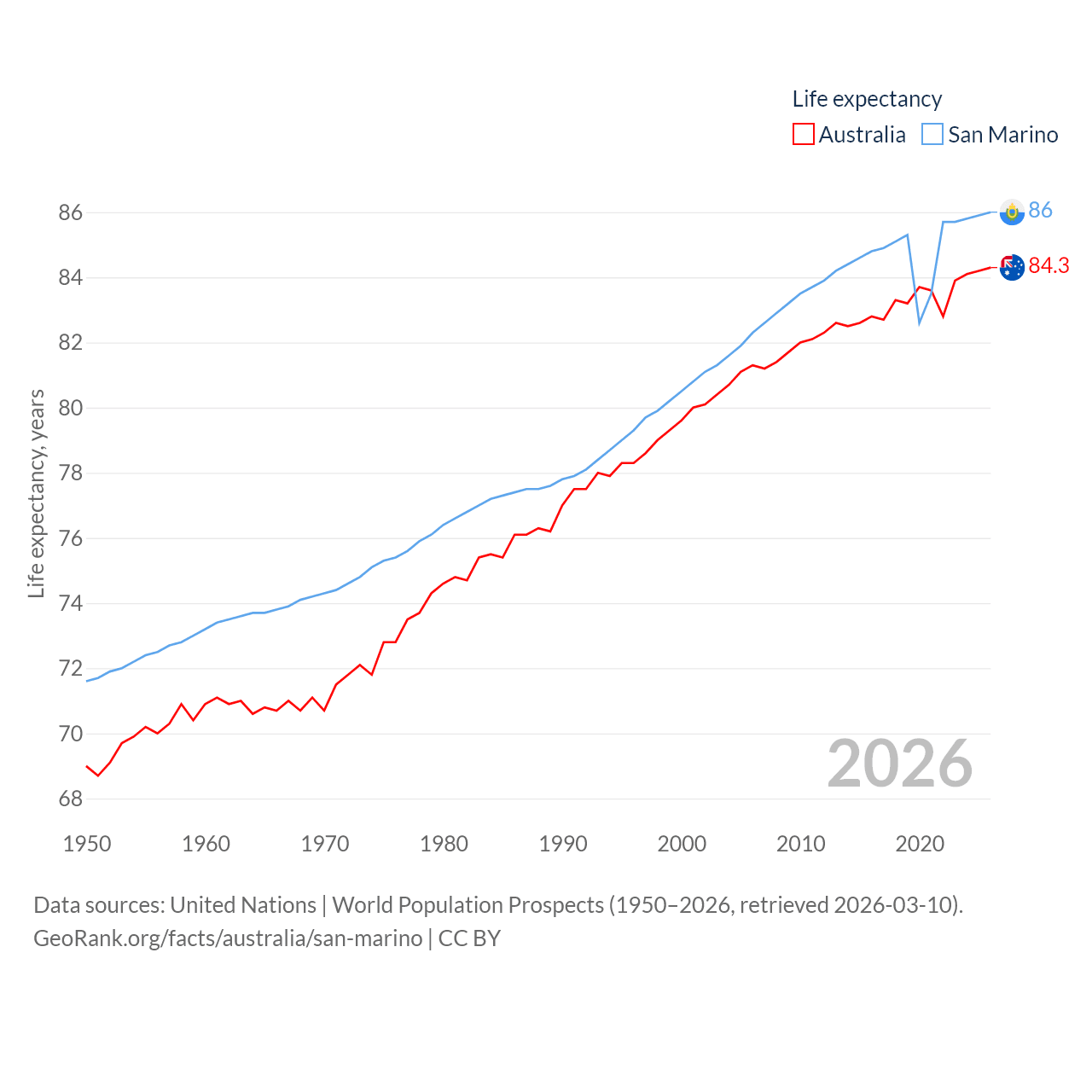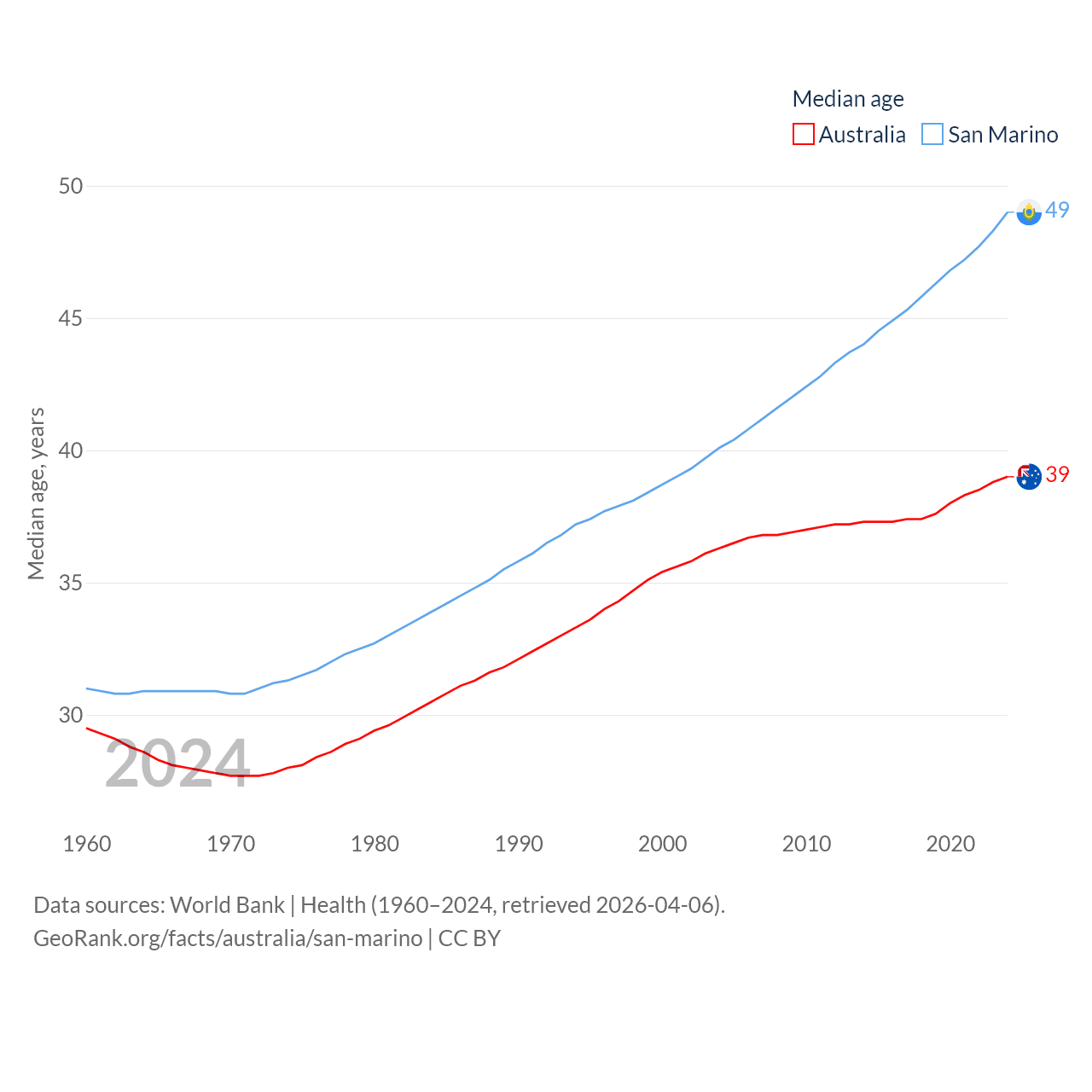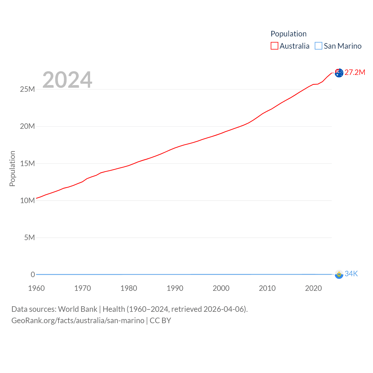 Australia has a population of 27.2M (ranked 54/197), compared with 34K in San Marino (ranked 193/197). Australia's land area is 2,969,906 sq mi versus 23.2 sq mi for San Marino (ranked 6th vs. 193rd).