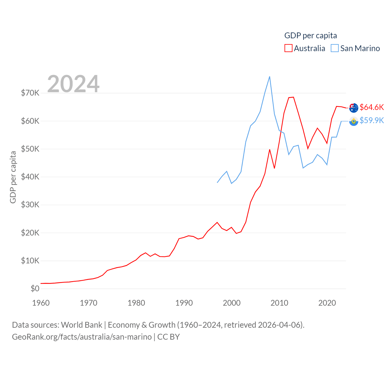 By GDP, Australia ranks 14/197 ($1.76T) and San Marino ranks 180/197 ($2.03B). By GDP per capita, Australia ranks 14/197 ($64,604), while San Marino ranks 15/197 ($59,880).