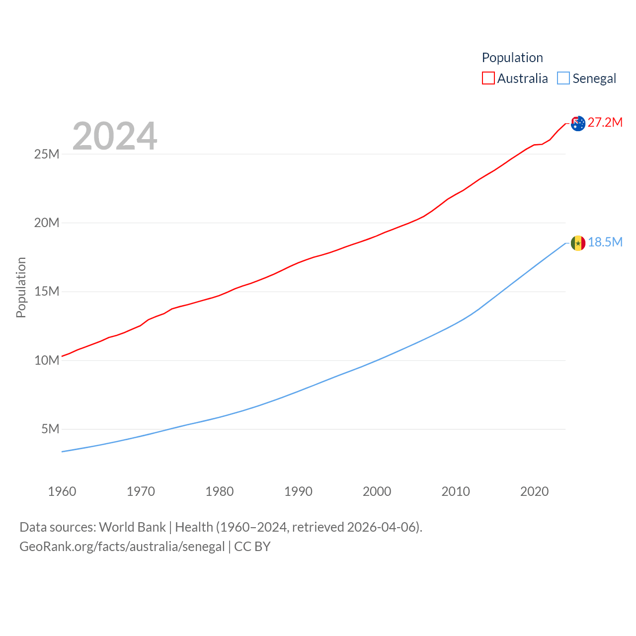 Australia has a population of 27.2M (ranked 54/197), compared with 18.5M in Senegal (ranked 69/197). Australia's land area is 2,969,906 sq mi versus 74,336 sq mi for Senegal (ranked 6th vs. 85th).