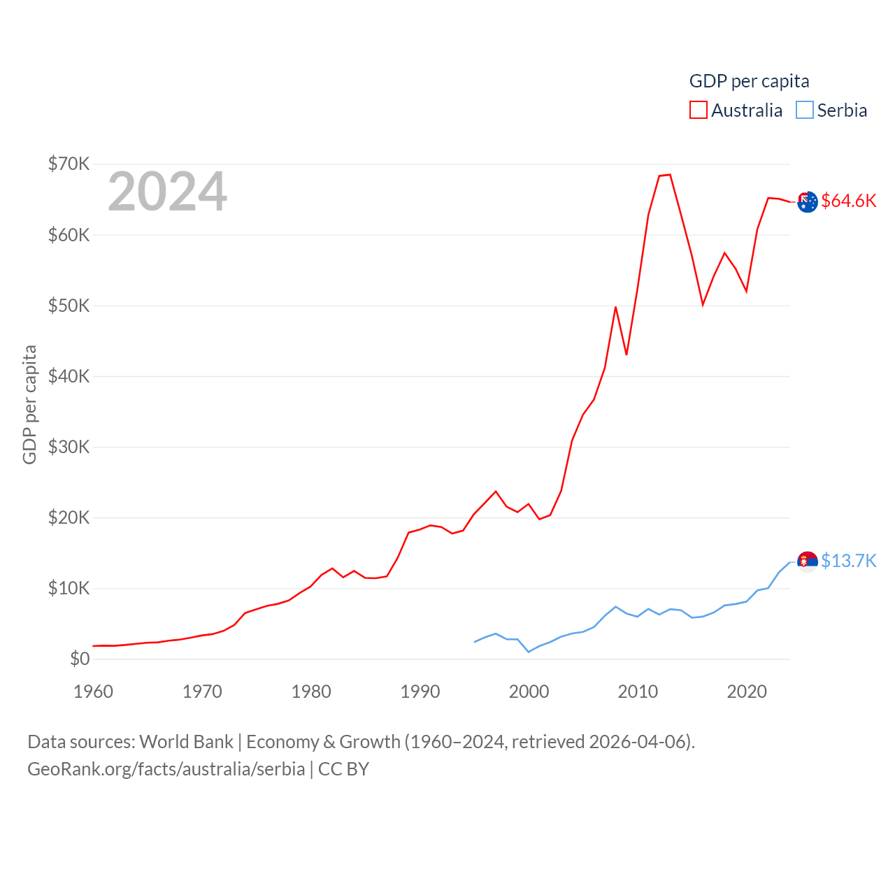 By GDP, Australia ranks 14/197 ($1.76T) and Serbia ranks 76/197 ($90.1B). By GDP per capita, Australia ranks 14/197 ($64,604), while Serbia ranks 73/197 ($13,679).