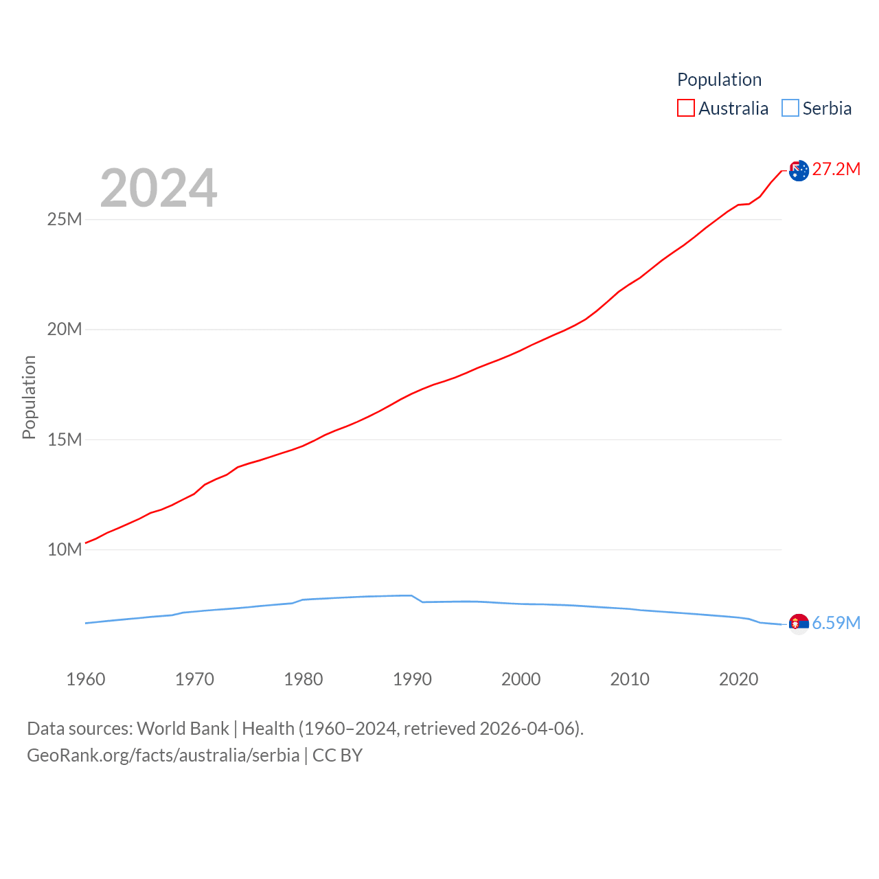 Australia has a population of 27.2M (ranked 54/197), compared with 6.59M in Serbia (ranked 109/197). Australia's land area is 2,969,906 sq mi versus 32,467 sq mi for Serbia (ranked 6th vs. 111th).