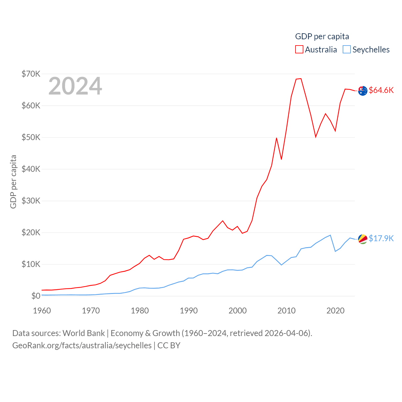 By GDP, Australia ranks 14/197 ($1.76T) and The Seychelles ranks 178/197 ($2.17B). By GDP per capita, Australia ranks 14/197 ($64,604), while The Seychelles ranks 63/197 ($17,859).