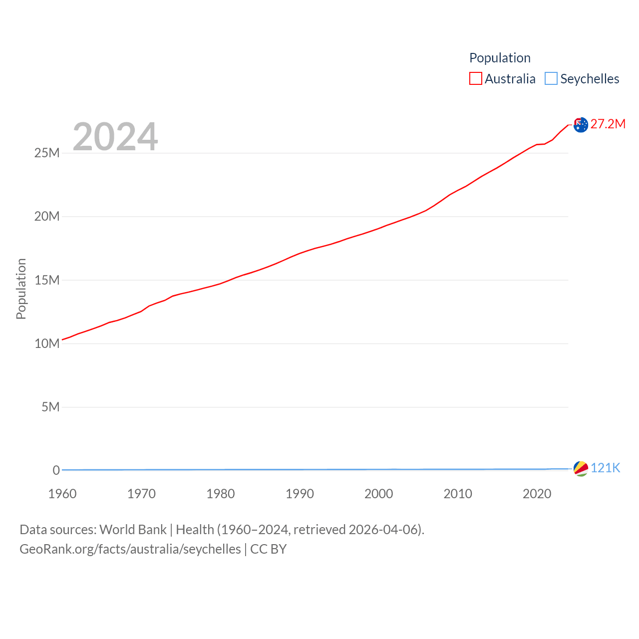 Australia has a population of 27.2M (ranked 54/197), compared with 121K in The Seychelles (ranked 181/197). Australia's land area is 2,969,906 sq mi versus 177.6 sq mi for The Seychelles (ranked 6th vs. 181st).