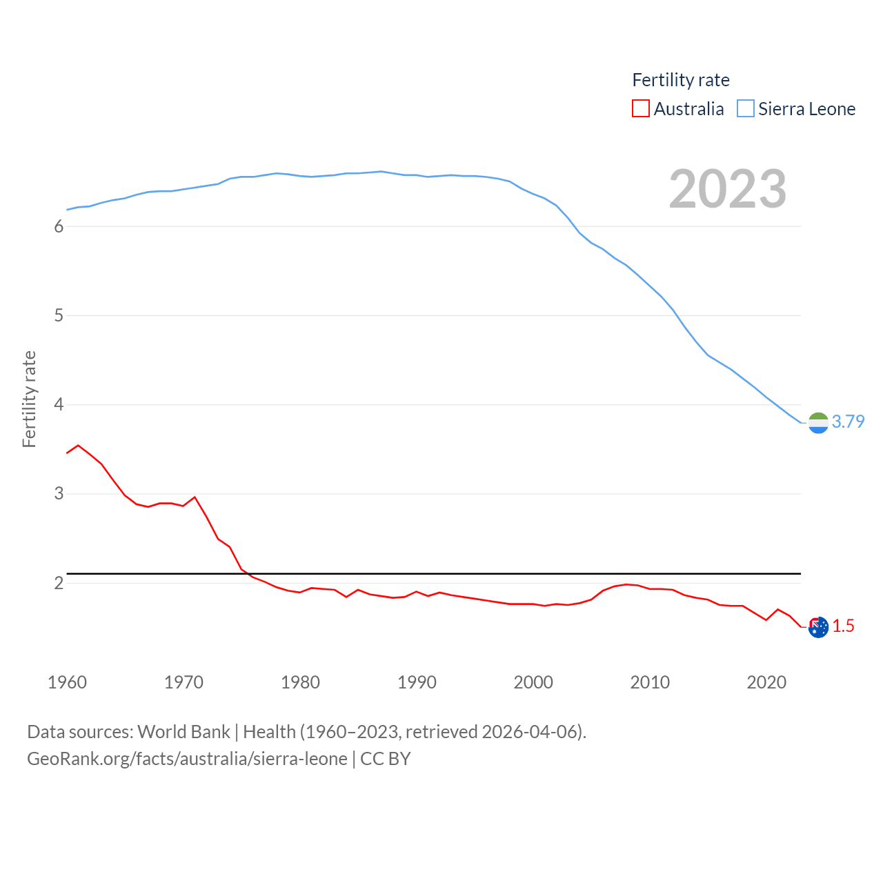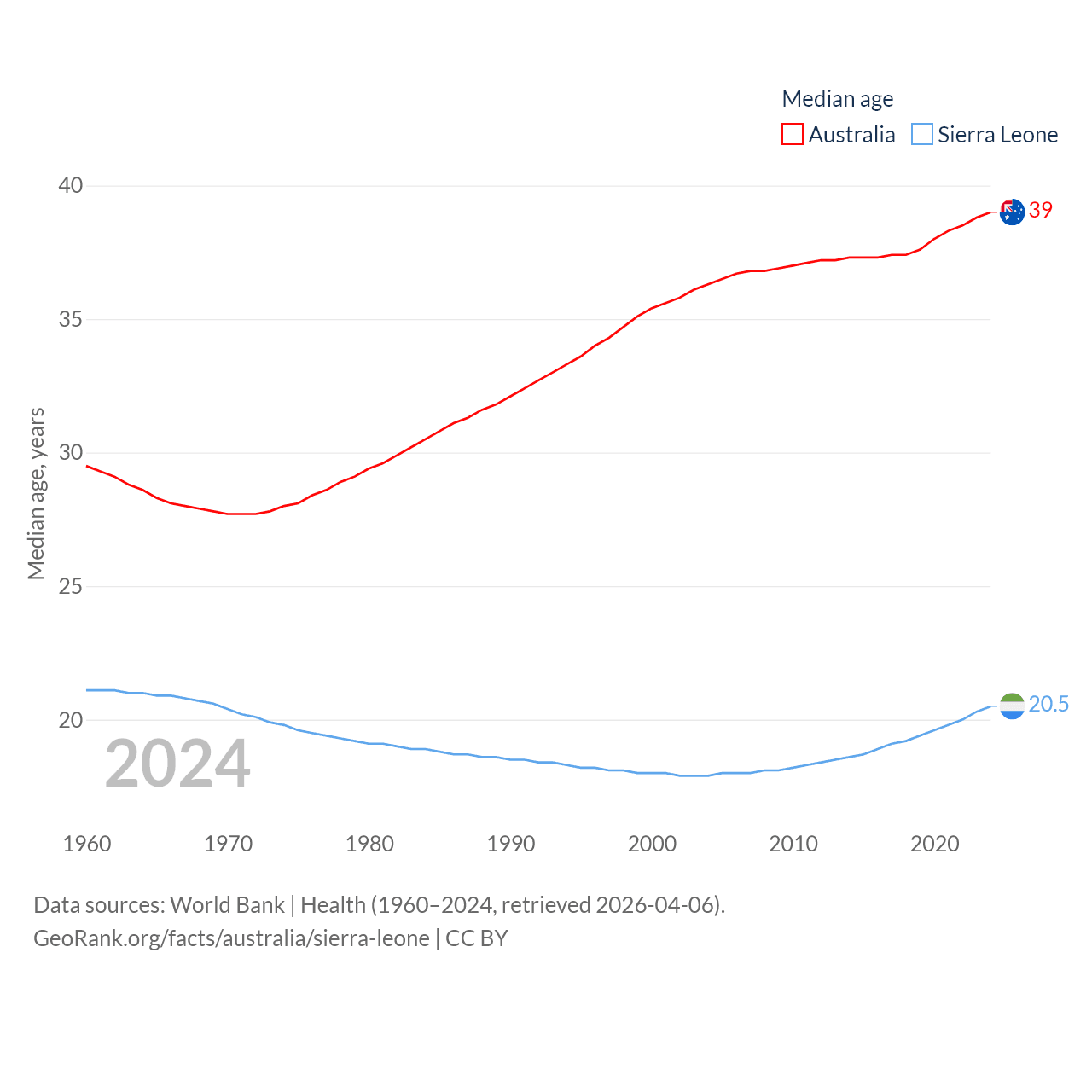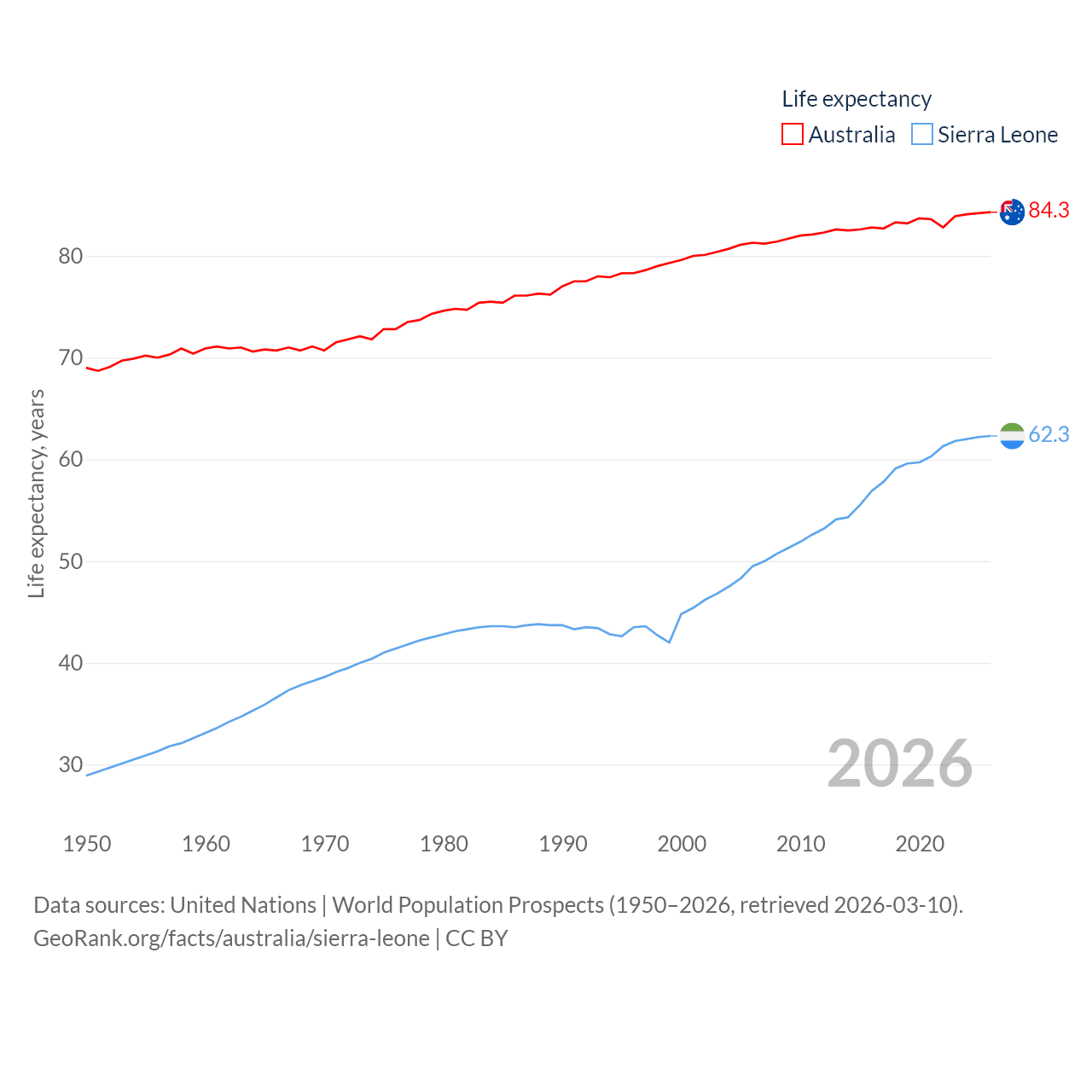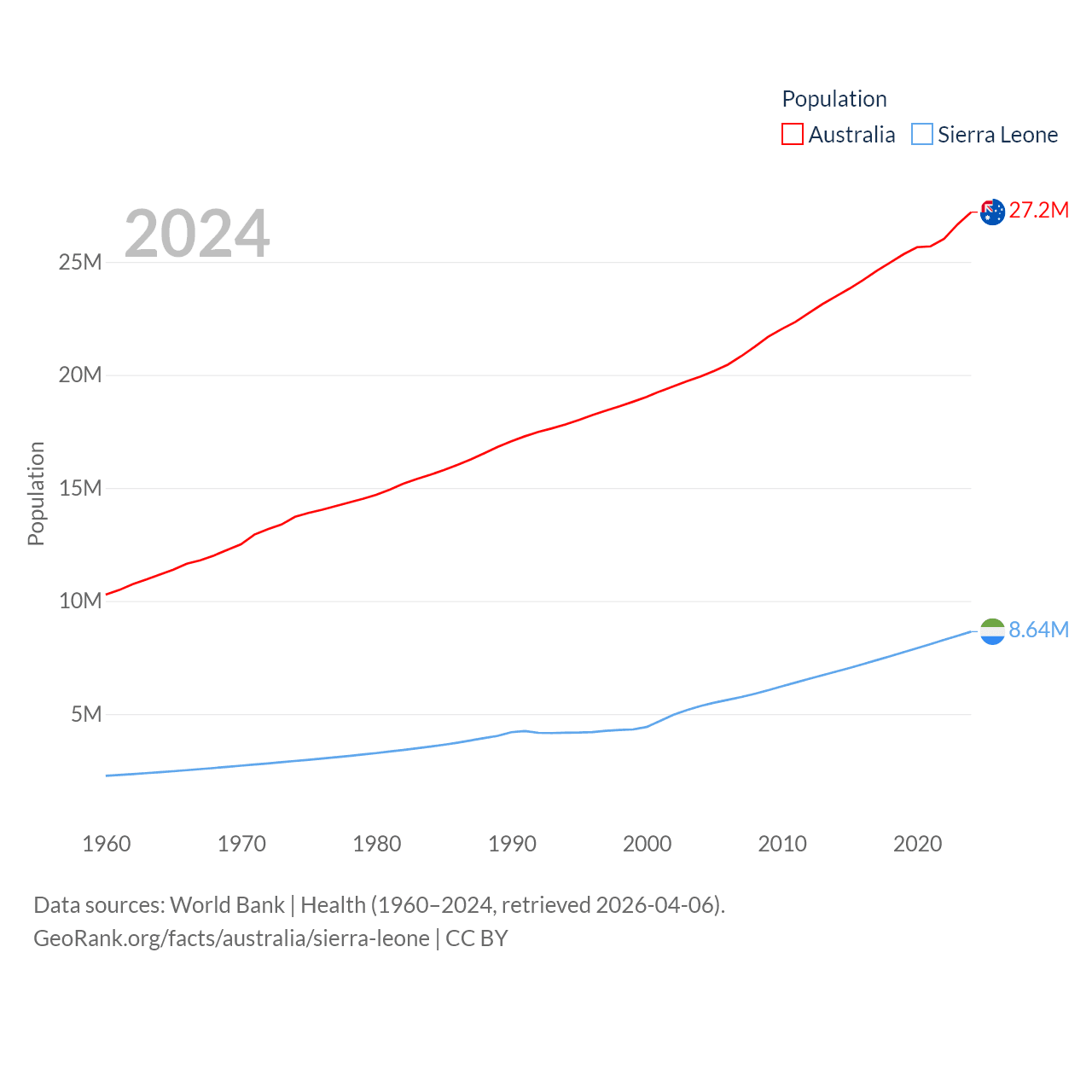 Australia has a population of 27.2M (ranked 54/197), compared with 8.64M in Sierra Leone (ranked 102/197). Australia's land area is 2,969,906 sq mi versus 27,869 sq mi for Sierra Leone (ranked 6th vs. 116th).