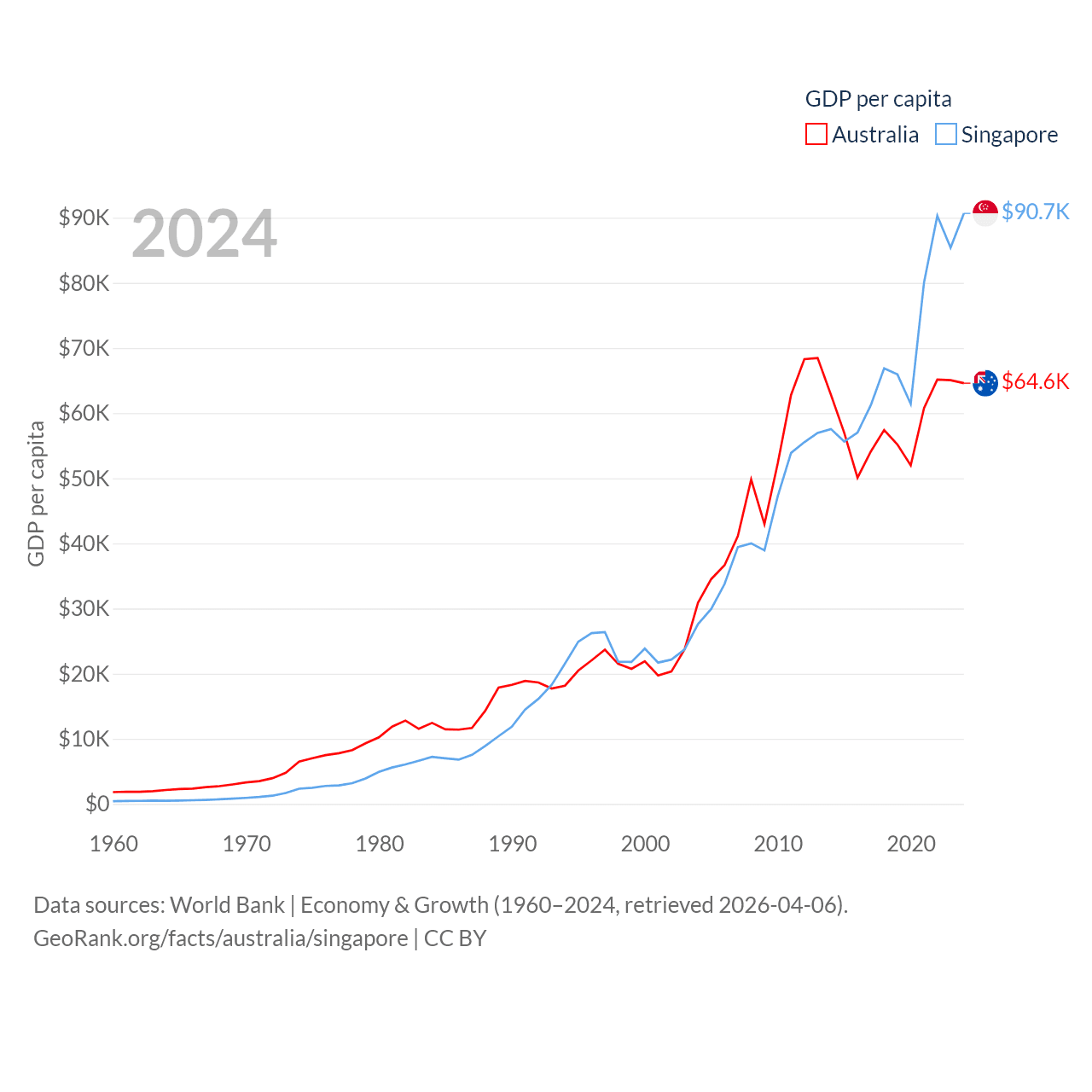 By GDP, Australia ranks 14/197 ($1.76T) and Singapore ranks 28/197 ($547B). By GDP per capita, Australia ranks 14/197 ($64,604), while Singapore ranks 7/197 ($90,674).