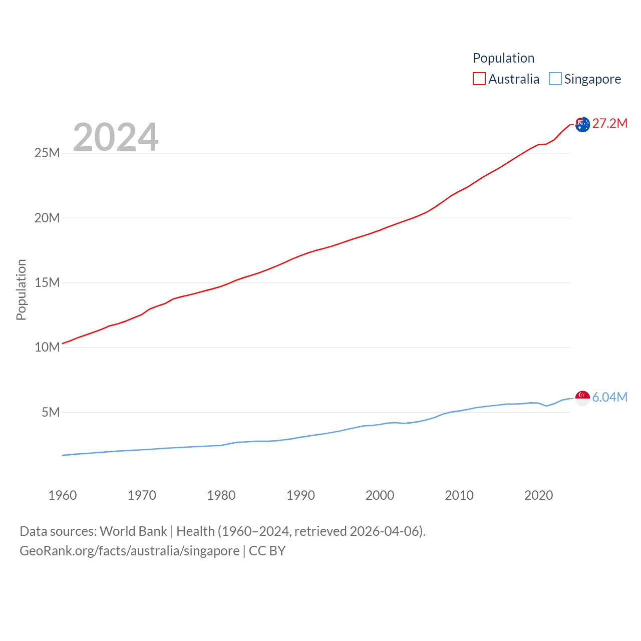 Australia has a population of 27.2M (ranked 54/197), compared with 6.04M in Singapore (ranked 113/197). Australia's land area is 2,969,906 sq mi versus 277.2 sq mi for Singapore (ranked 6th vs. 177th).