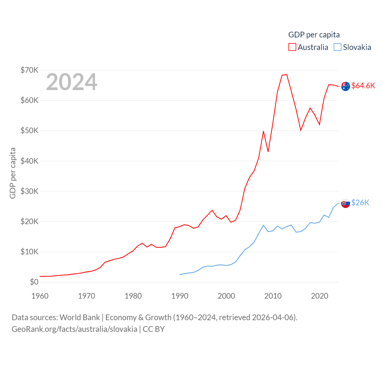 By GDP, Australia ranks 14/197 ($1.76T) and Slovakia ranks 61/197 ($141B). By GDP per capita, Australia ranks 14/197 ($64,604), while Slovakia ranks 47/197 ($25,993).