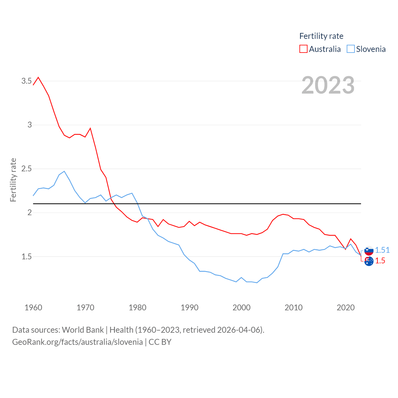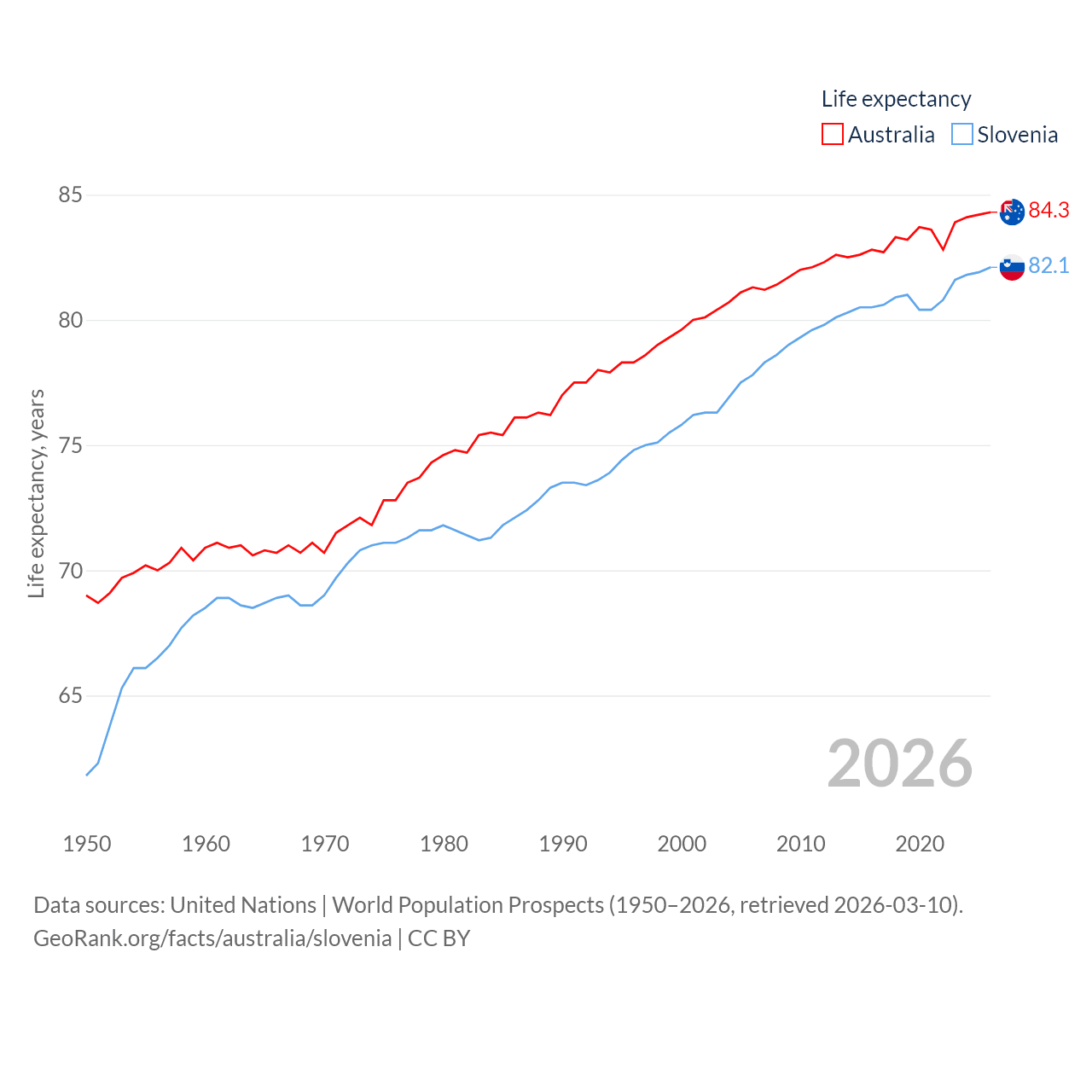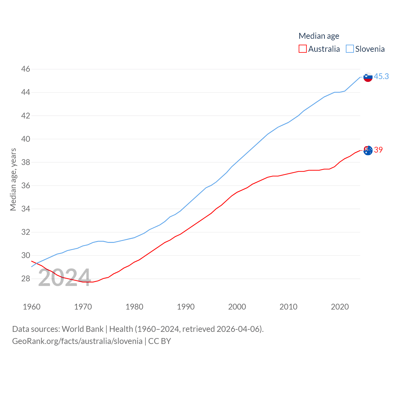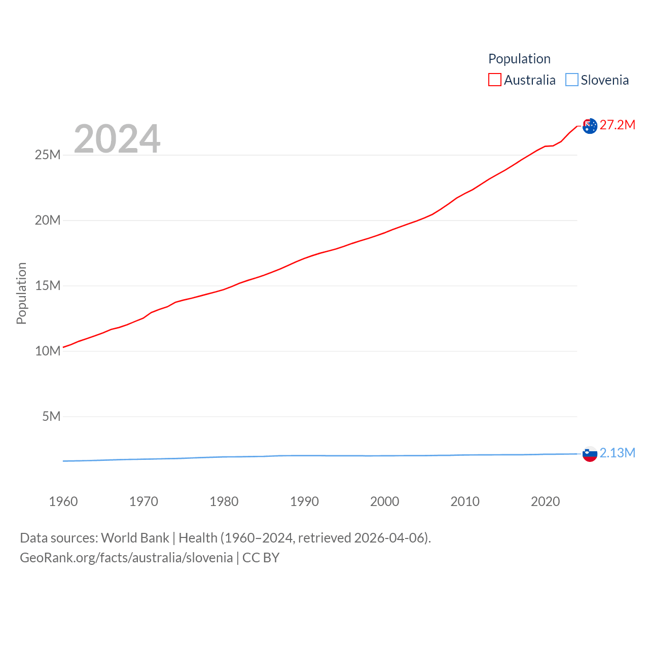 Australia has a population of 27.2M (ranked 54/197), compared with 2.13M in Slovenia (ranked 147/197). Australia's land area is 2,969,906 sq mi versus 7,774 sq mi for Slovenia (ranked 6th vs. 151st).