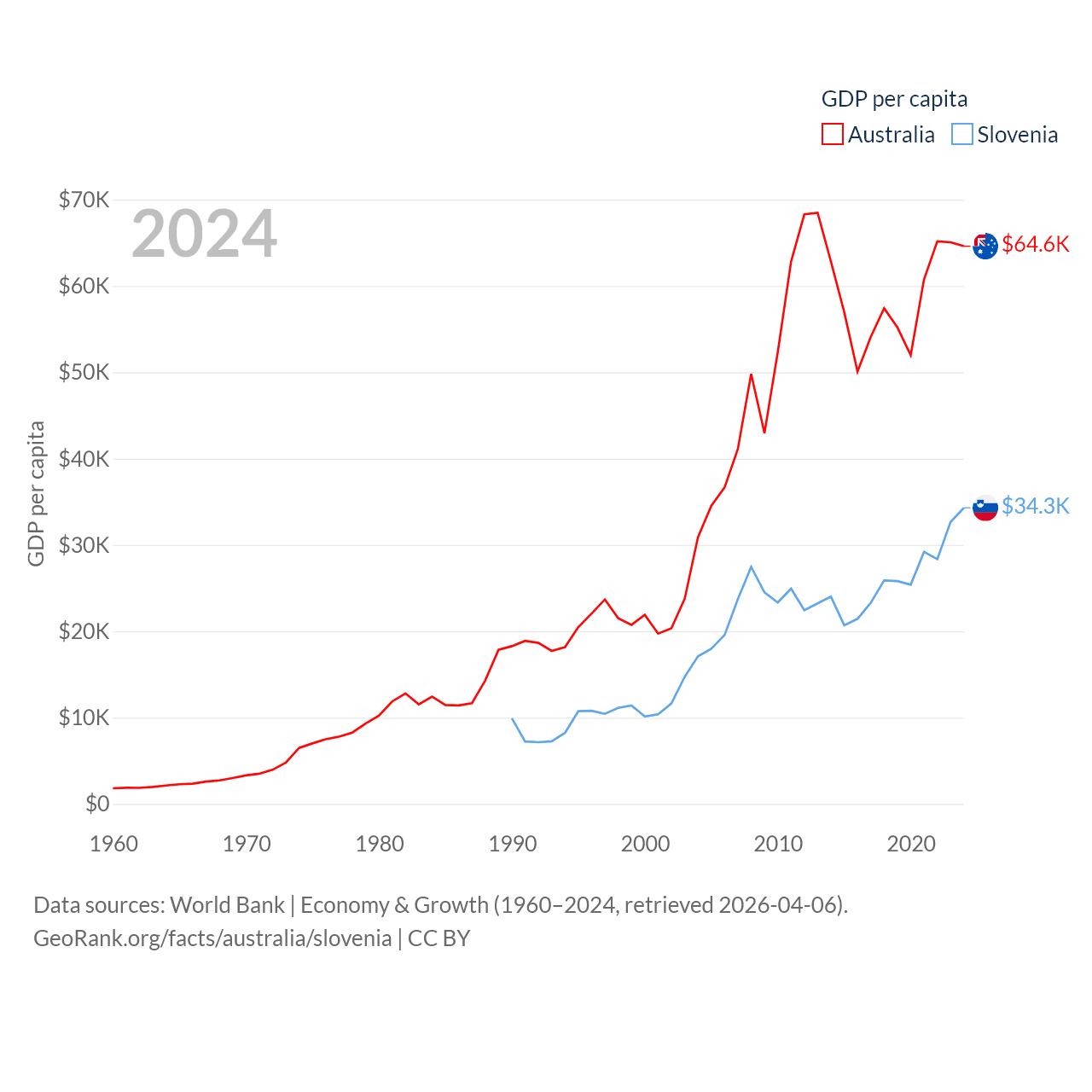 By GDP, Australia ranks 14/197 ($1.76T) and Slovenia ranks 86/197 ($73B). By GDP per capita, Australia ranks 14/197 ($64,604), while Slovenia ranks 34/197 ($34,301).