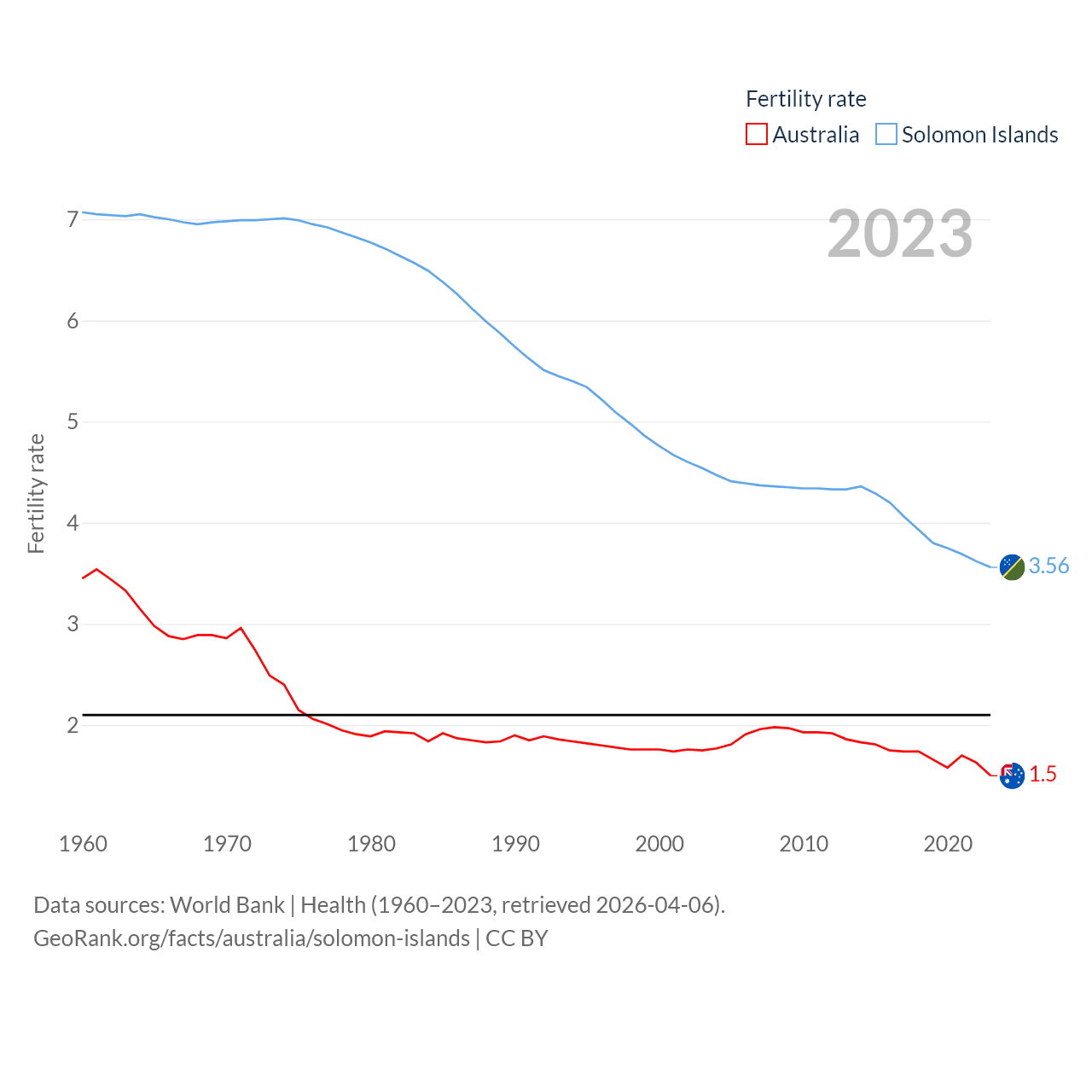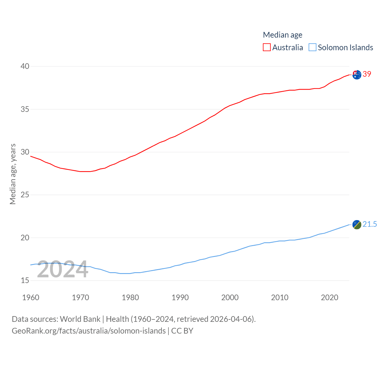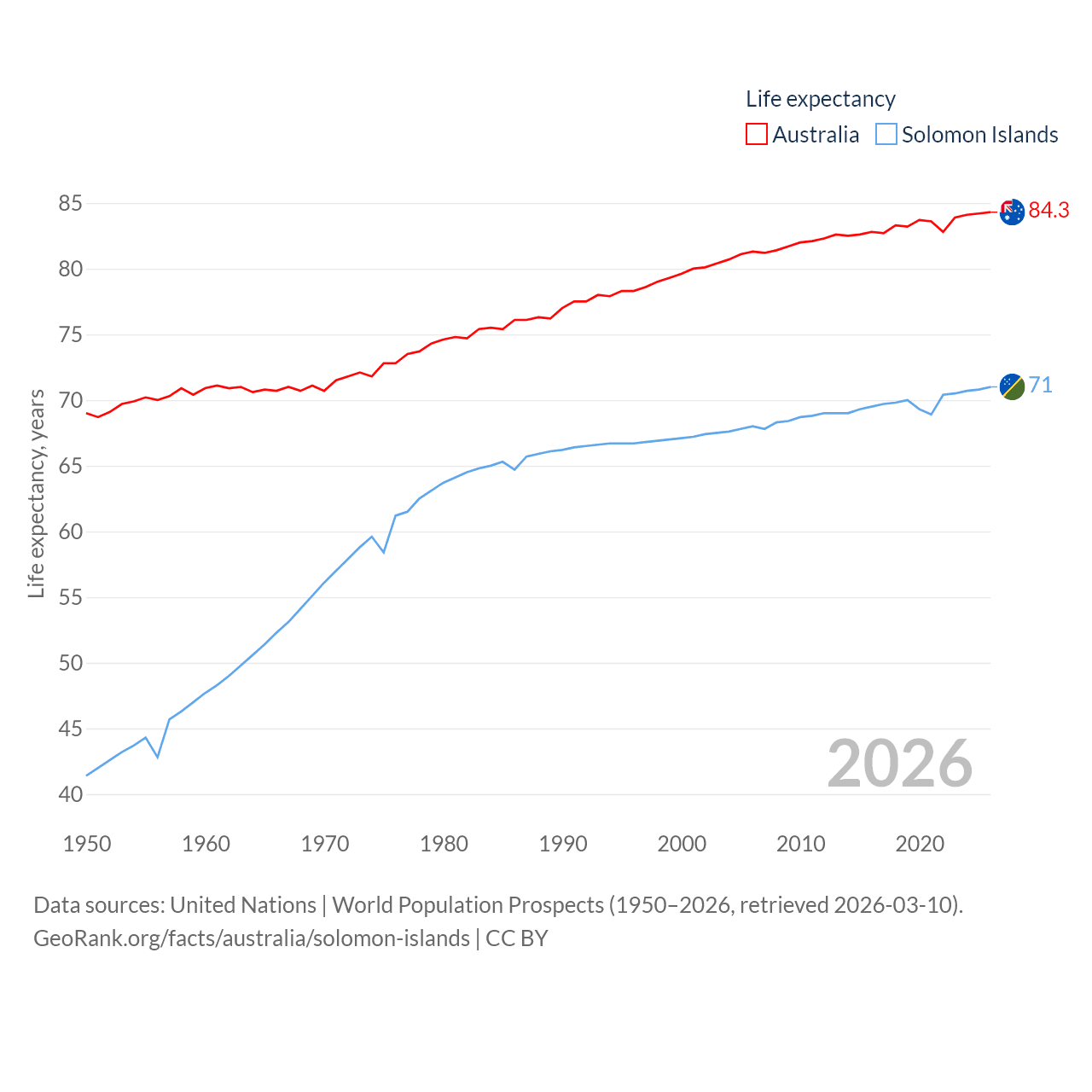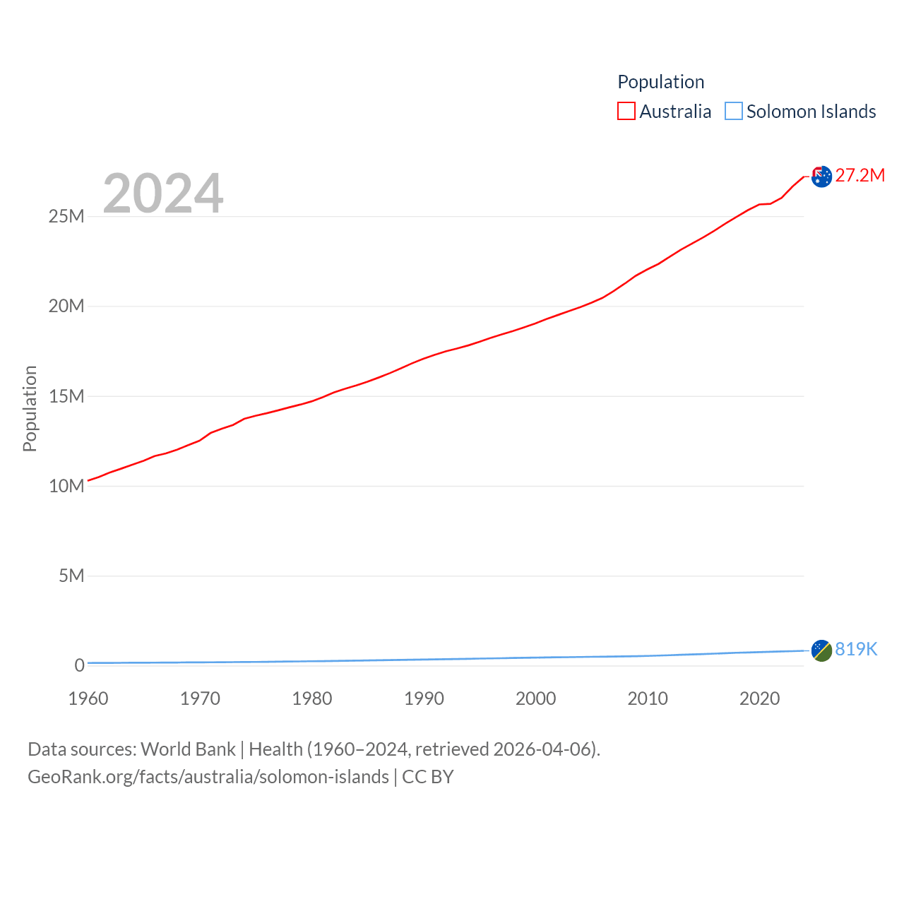 Australia has a population of 27.2M (ranked 54/197), compared with 819K in The Solomon Islands (ranked 162/197). Australia's land area is 2,969,906 sq mi versus 10,807 sq mi for The Solomon Islands (ranked 6th vs. 141st).