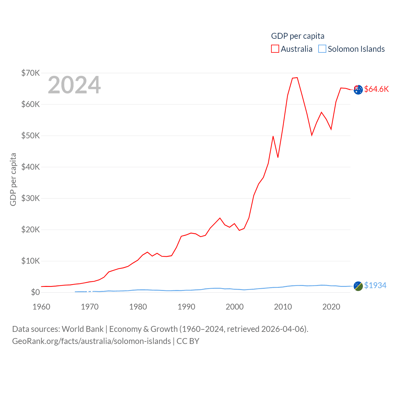 By GDP, Australia ranks 14/197 ($1.76T) and The Solomon Islands ranks 182/197 ($1.58B). By GDP per capita, Australia ranks 14/197 ($64,604), while The Solomon Islands ranks 157/197 ($1,934).