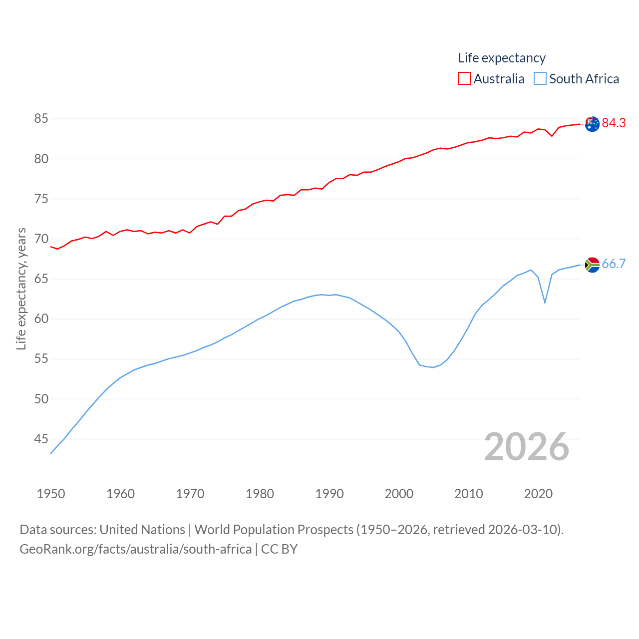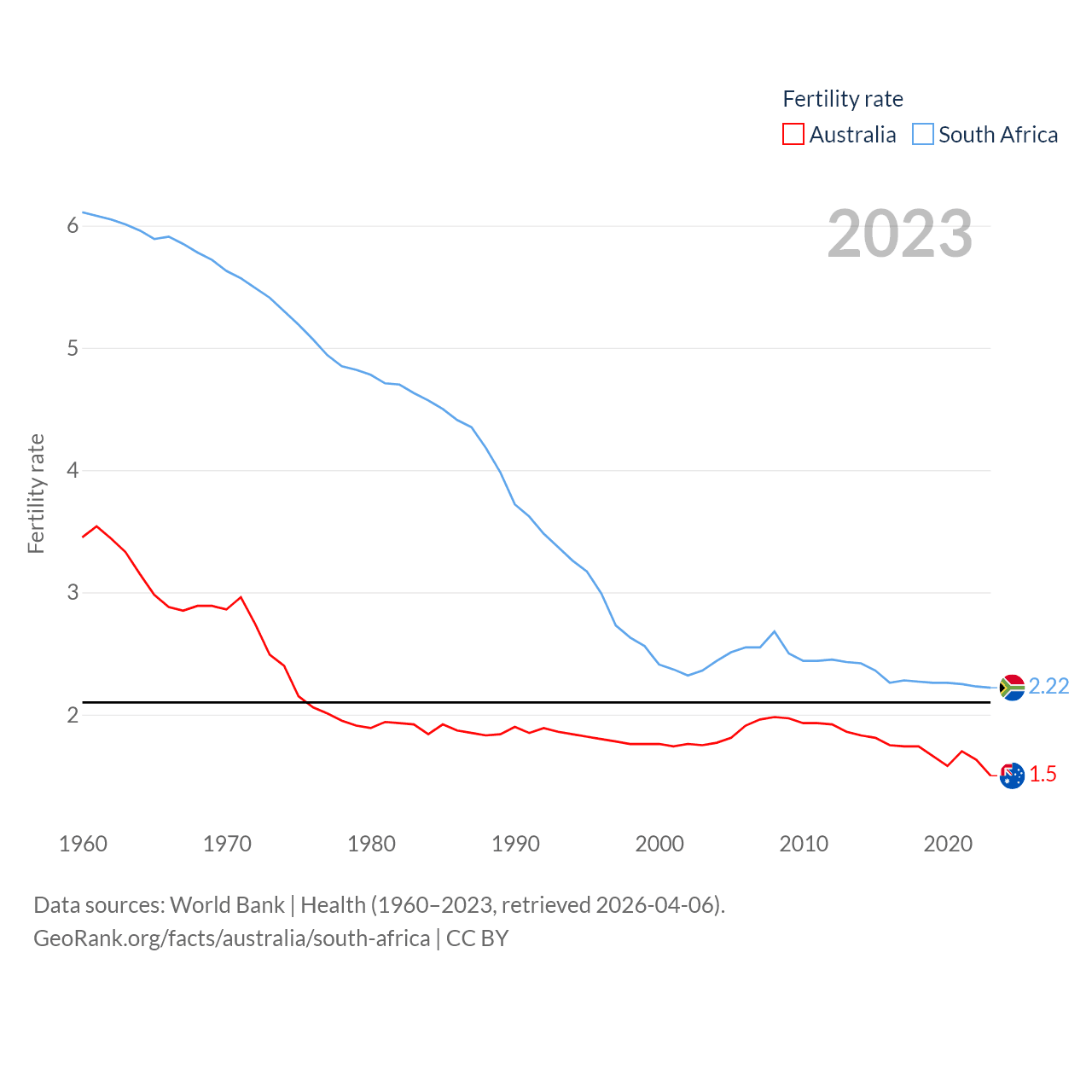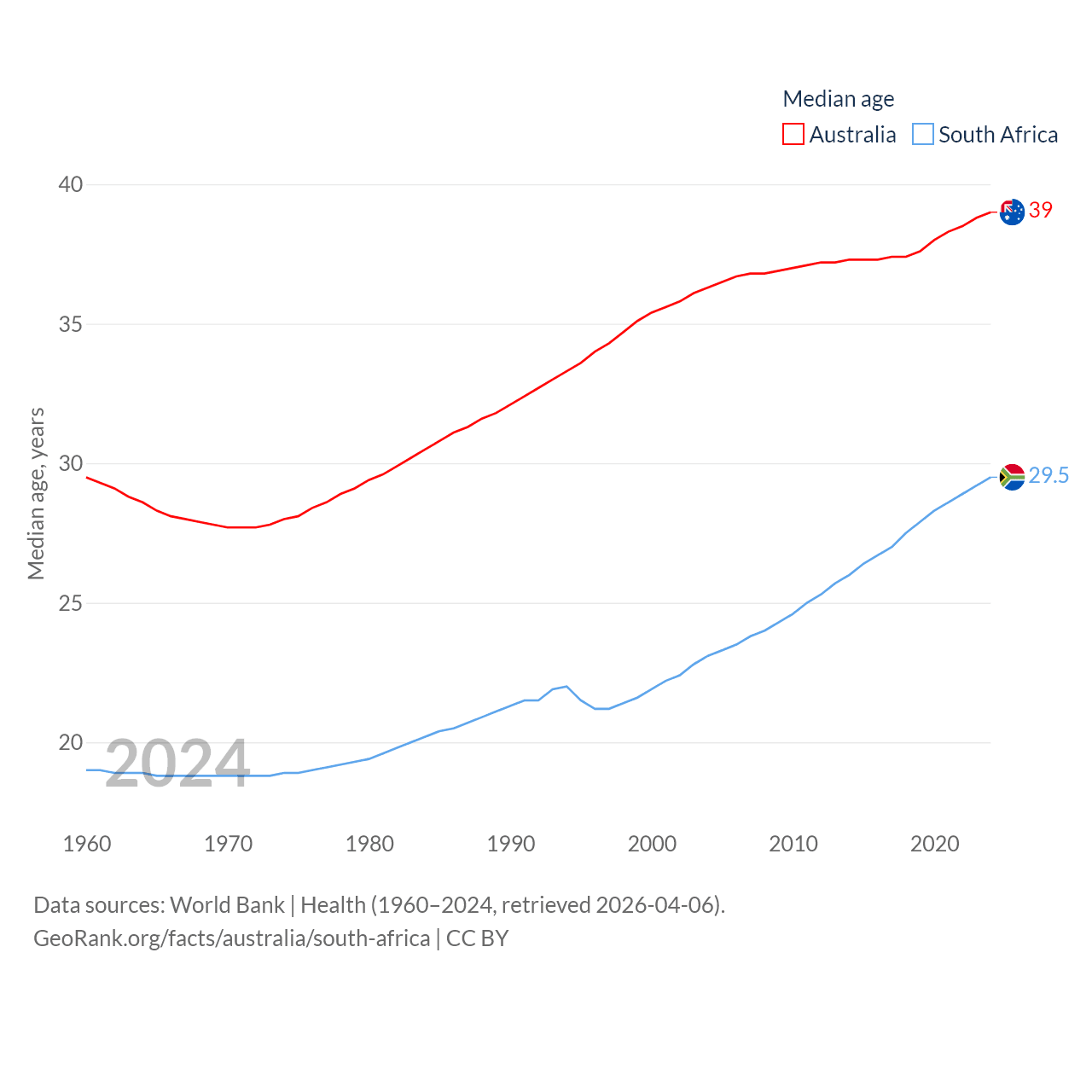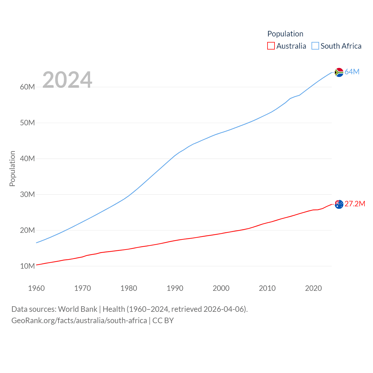 Australia has a population of 27.2M (ranked 54/197), compared with 64M in South Africa (ranked 24/197). Australia's land area is 2,969,906 sq mi versus 468,377 sq mi for South Africa (ranked 6th vs. 24th).
