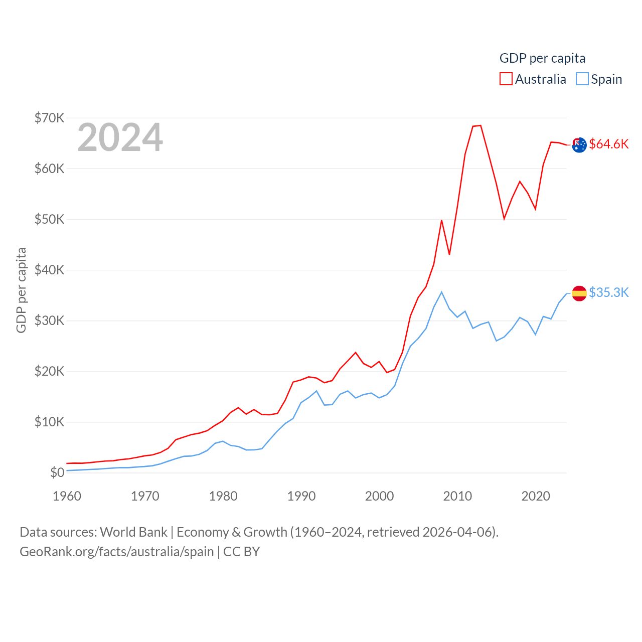 By GDP, Australia ranks 14/197 ($1.76T) and Spain ranks 15/197 ($1.73T). By GDP per capita, Australia ranks 14/197 ($64,604), while Spain ranks 32/197 ($35,327).