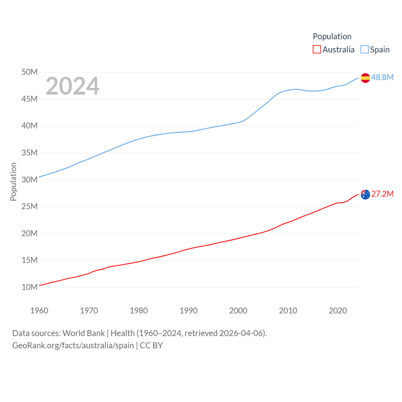 Australia has a population of 27.2M (ranked 54/197), compared with 48.8M in Spain (ranked 32/197). Australia's land area is 2,969,906 sq mi versus 192,934 sq mi for Spain (ranked 6th vs. 51st).