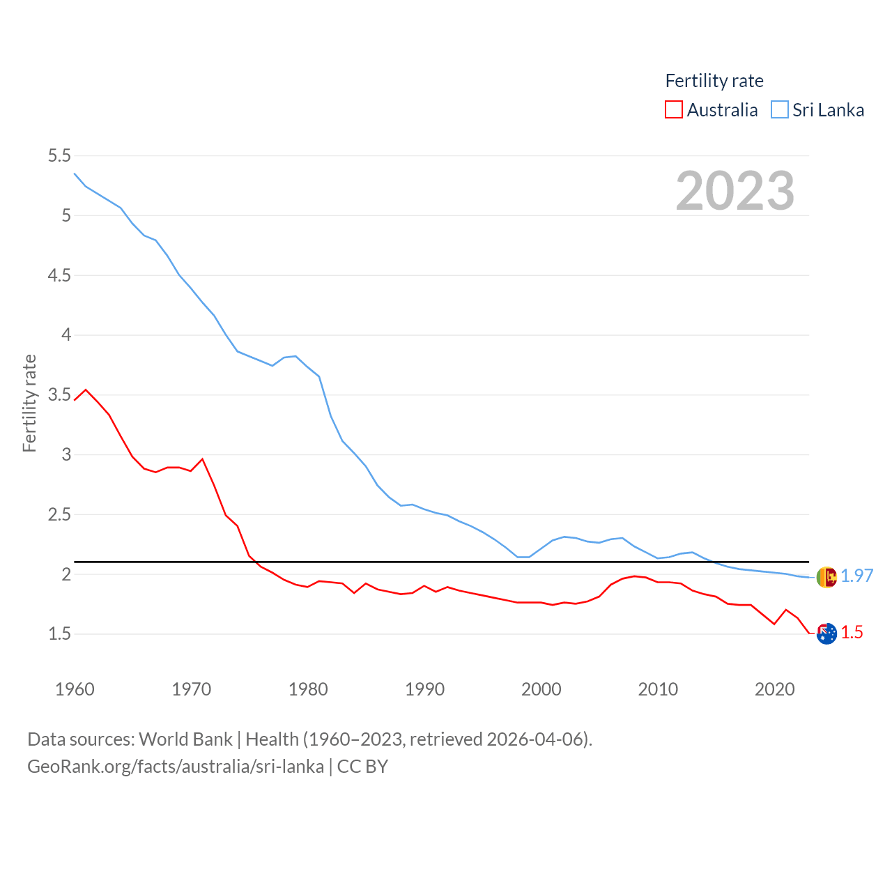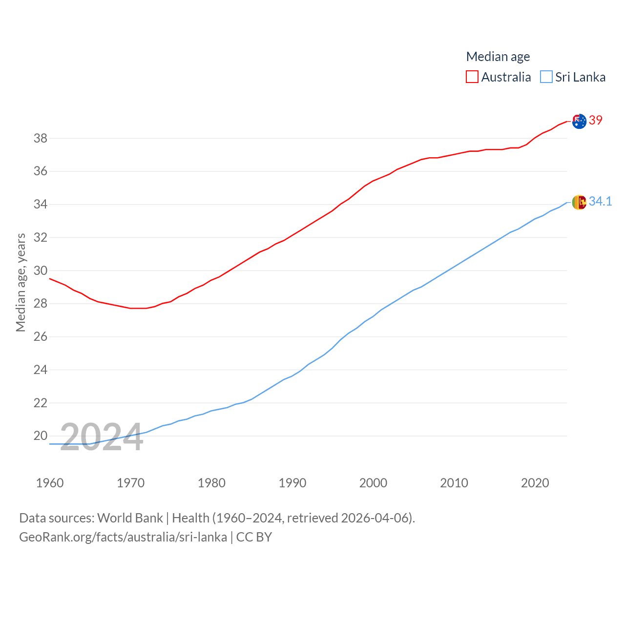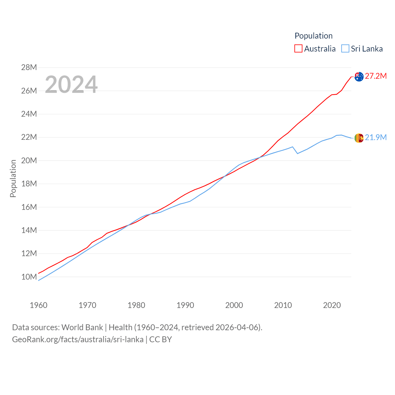 Australia has a population of 27.2M (ranked 54/197), compared with 21.9M in Sri Lanka (ranked 61/197). Australia's land area is 2,969,906 sq mi versus 23,884 sq mi for Sri Lanka (ranked 6th vs. 122nd).