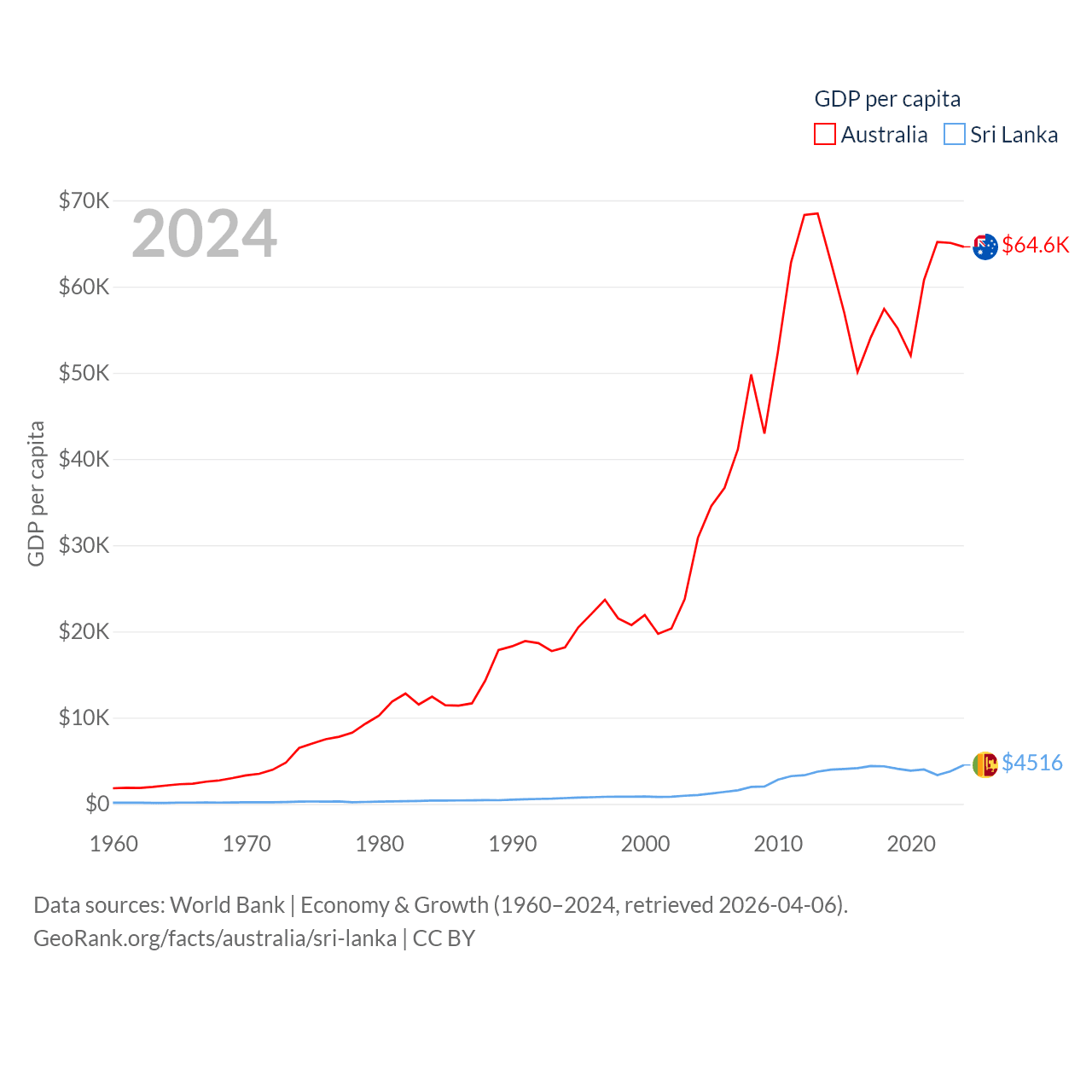 By GDP, Australia ranks 14/197 ($1.76T) and Sri Lanka ranks 72/197 ($99B). By GDP per capita, Australia ranks 14/197 ($64,604), while Sri Lanka ranks 124/197 ($4,516).