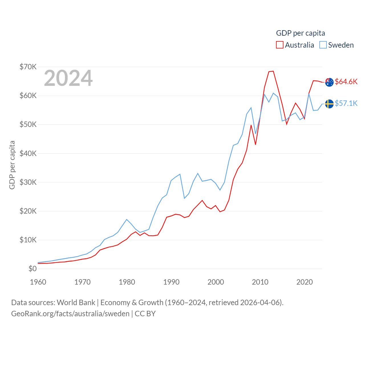 By GDP, Australia ranks 14/197 ($1.76T) and Sweden ranks 26/197 ($604B). By GDP per capita, Australia ranks 14/197 ($64,604), while Sweden ranks 17/197 ($57,117).