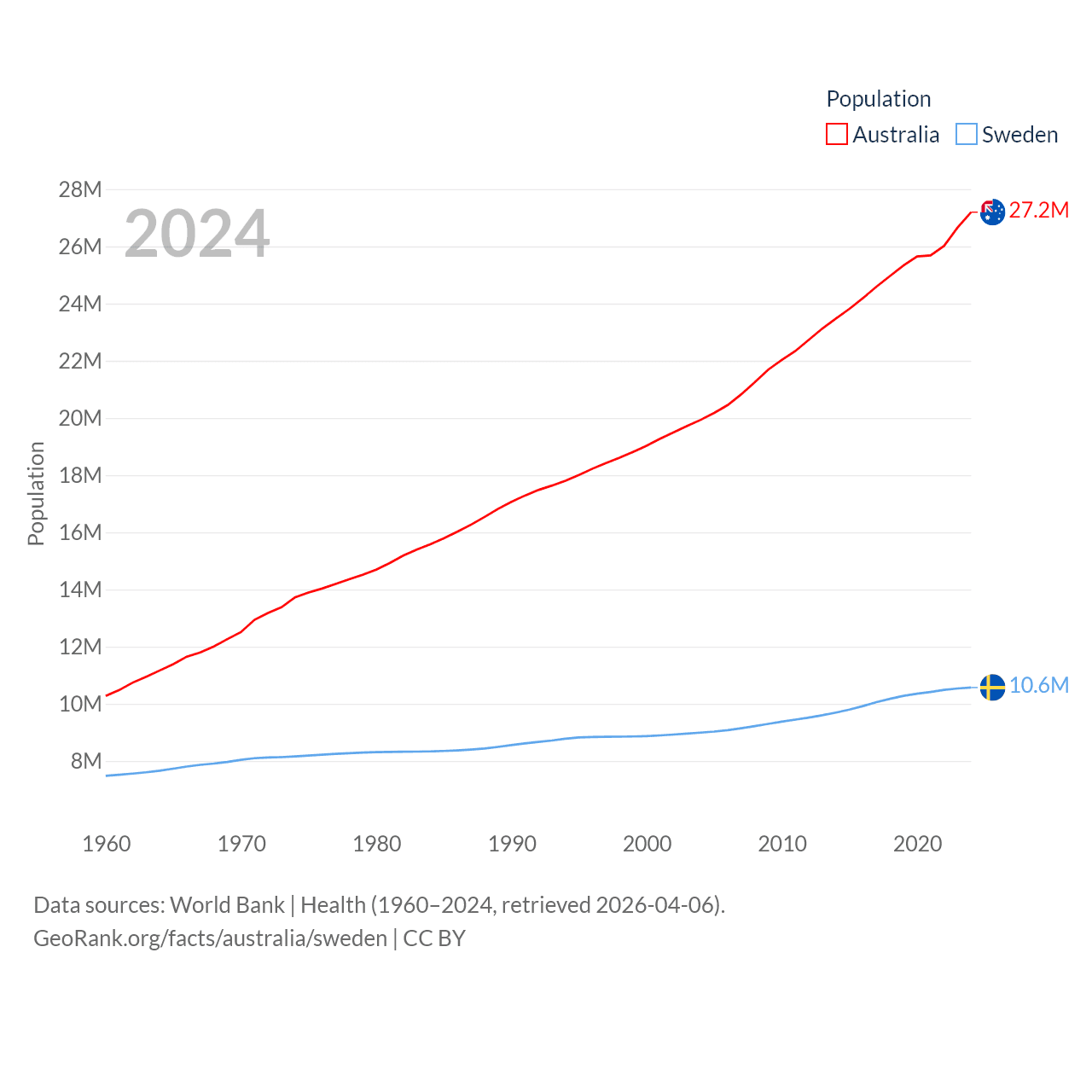 Australia has a population of 27.2M (ranked 54/197), compared with 10.6M in Sweden (ranked 93/197). Australia's land area is 2,969,906 sq mi versus 157,248 sq mi for Sweden (ranked 6th vs. 58th).