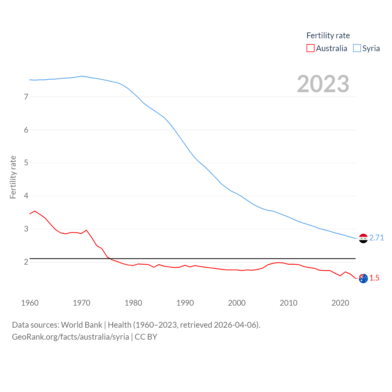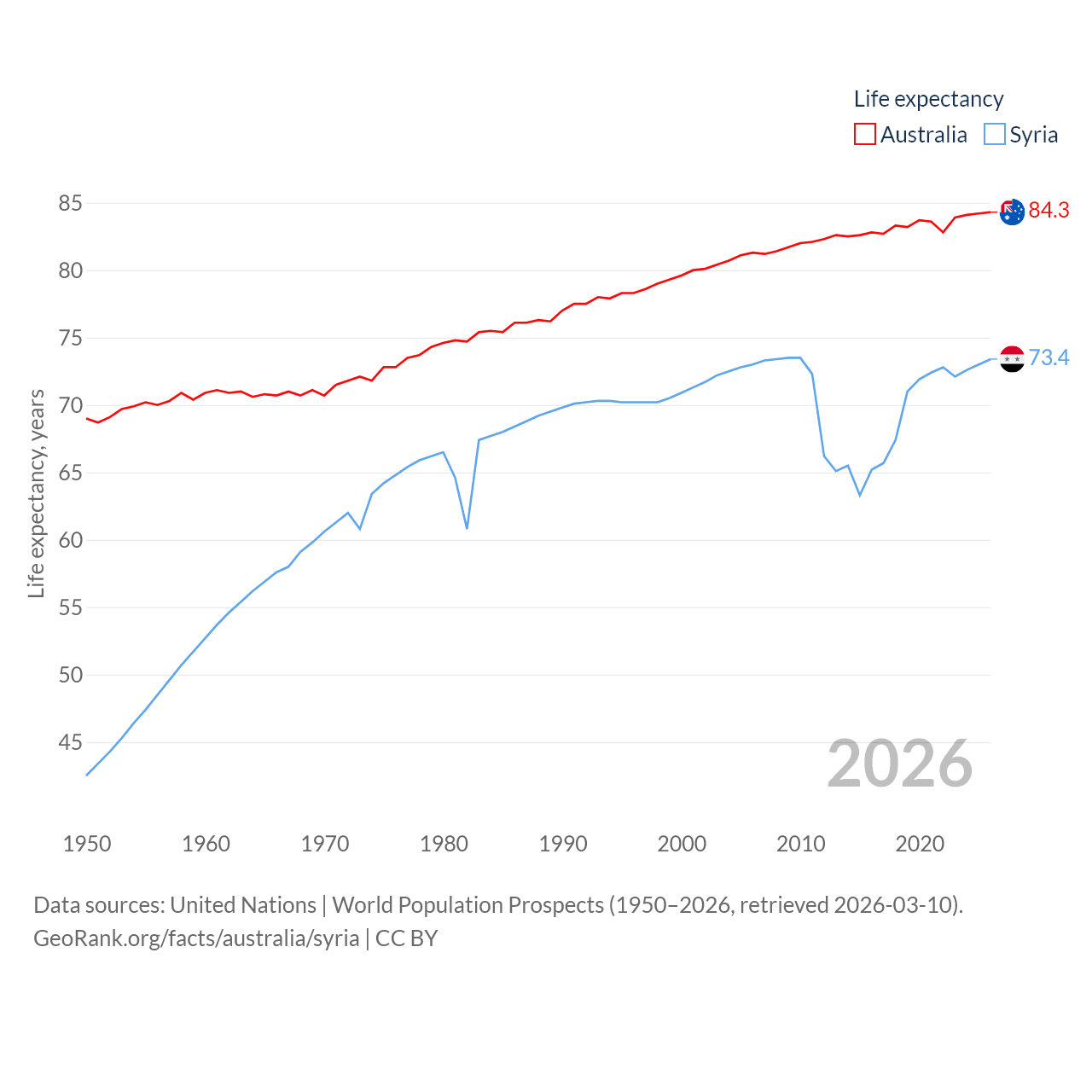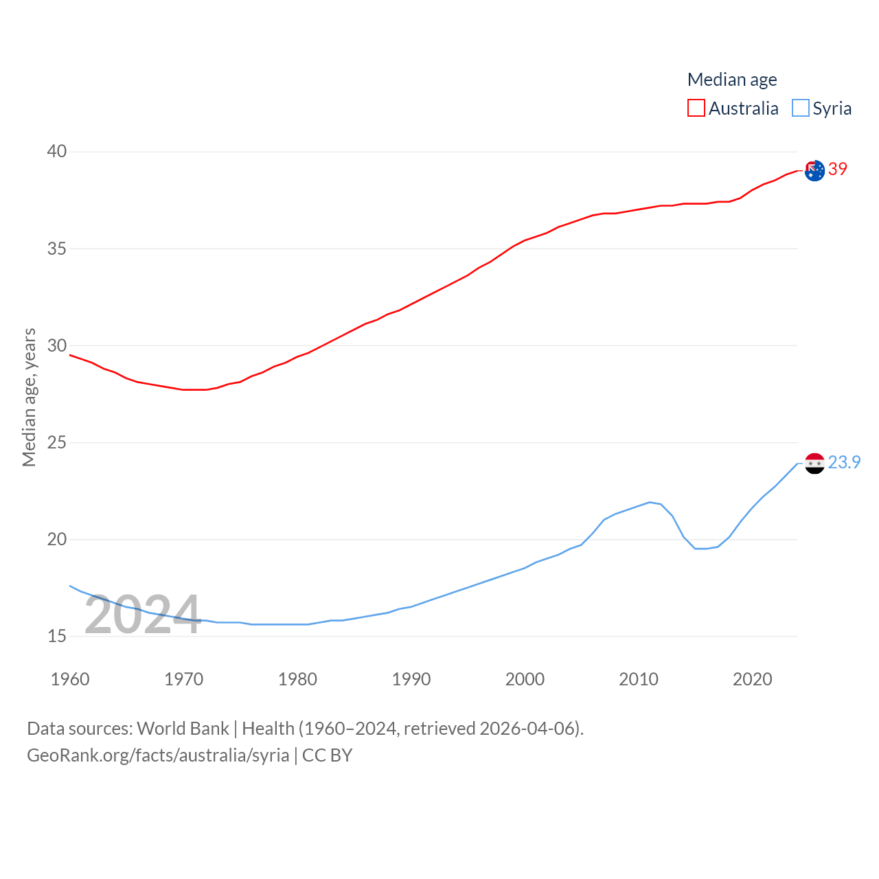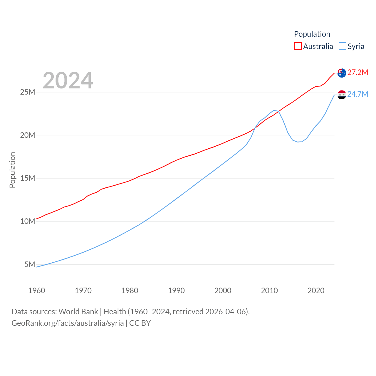 Australia has a population of 27.2M (ranked 54/197), compared with 24.7M in Syria (ranked 57/197). Australia's land area is 2,969,906 sq mi versus 70,900 sq mi for Syria (ranked 6th vs. 87th).